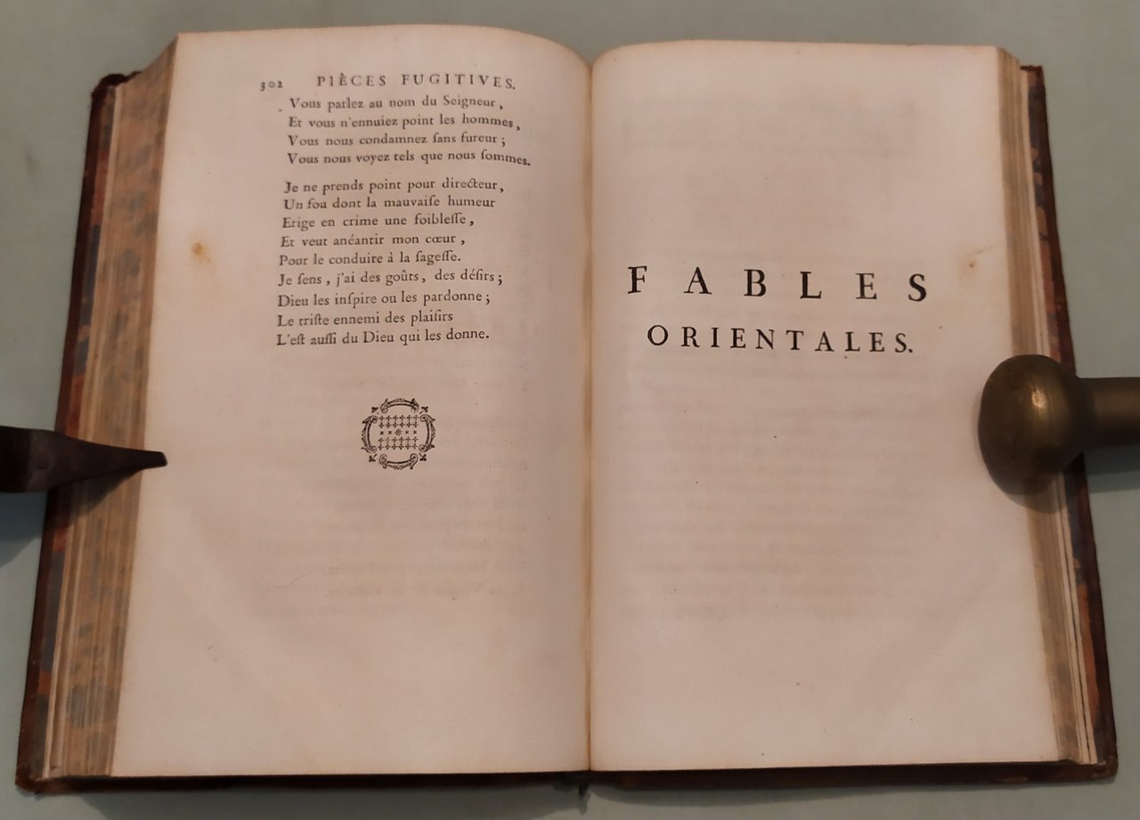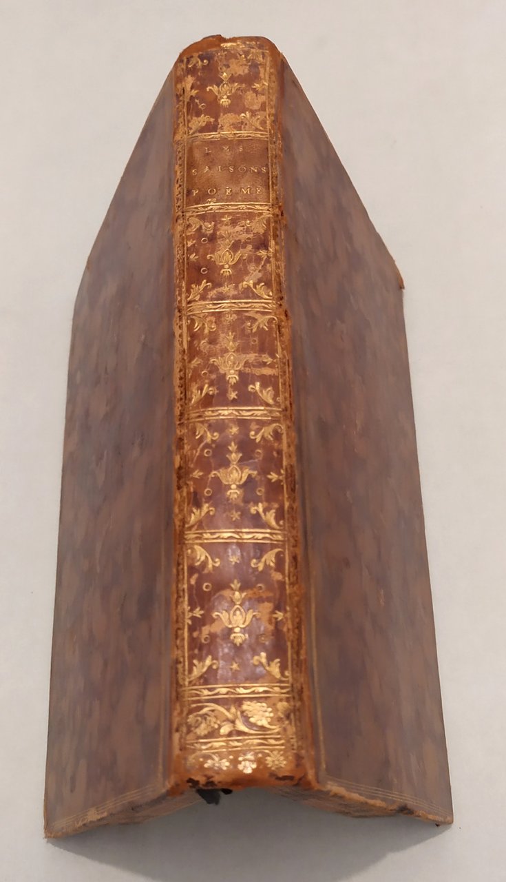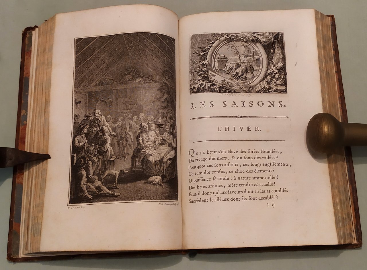 SAINT LAMBERT J.F. Les Saisons, poeme. A Amsterdam, 1769. In 8vo; pp. XXVIII, 369. 5 tavole di Le Prince e Gravelot incise da Delaunay, Prevost, Rousseau, Saint Aubin e Watelet. Al frontespizio vignetta con una lira. 4 testate incise all'acquaforte da Choffard. Finaletti. Legatura coeva in bazzana maculata, ai piatti filettatura dorata, dorso a cordoni con ricchi fregi e titolo in oro. Questa opera di carattere campestre e pastorale, pubblicata anonima a Parigi, può essere considerata una testimonianza schiettamente settecentesca del modo di intendere la poesia e la sua funzione sociale. Edizione originale. Cohen, 926.