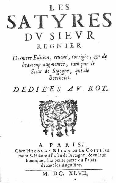 LES SATYRES. - Dernière édition, revue, corrigée, & de beaucoup augmentée, tant par le Sieur de Sigogne, que de Barthelot.