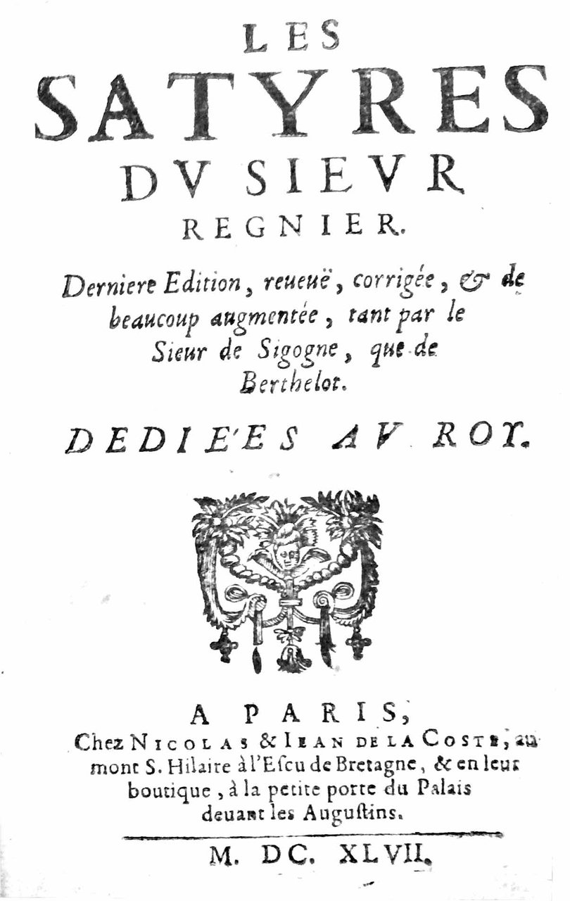 In-16 p. (mm. 161x103), p. pelle ottocentesca, dorso a cordoni con titolo oro, dentelles dorate ai risg. damascati, tagli dorati, pp. (8),262, ornato da fregi e grandi capilettera inc. su legno. Questa edizione contiene: 17 satire del Regnier - Elégie zélotipique - L'Impuissance, imitation d'Ovide - Stances - Discours au Roy - Autres Satyres et Folastreries, tant du Sieur de Sigognes & Bertelot, qu'autres des plus signalez Poetes de ce temps. Stampata per la prima volta nel 1608 con il titolo di Les premières oeuvres.., l'opera satirica di Mathurin Regnier (1573-1613) ebbe molto successo e fu aumentata e corretta nelle successive numerose edizioni. Cfr. Brunet,IV,1187-1188. Leggerm. corto del marg. super.; qualche lieve fiorit. e pagg. ingiallite per la qualità della carta ma buon esemplare.