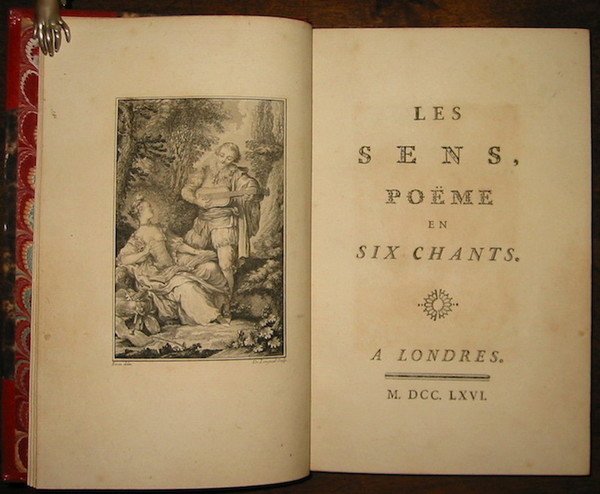 4to (cm. 21,5), 2 cc.nn., XX pp. da p. 21 a p. 184. Con 9 tavv. f.t. (di cui una in antiporta e 2 di musica), testatine e culs-de-lampe, il tutto inciso su rame dal De Longueil su disegni di Ch. Eisen e Wille. Bella legatura coeva in mz. marocchino rosso con angoli. Nervi, ricchi fregi e titolo impresso in oro al ds. Tagli dorati. Carte di guardia marmorizzate. Esemplare in ottimo stato di conservazione. Edizione originale. Per il nome dell’Autore ed il luogo di pubblicazione cfr. Barbier IV, 464.