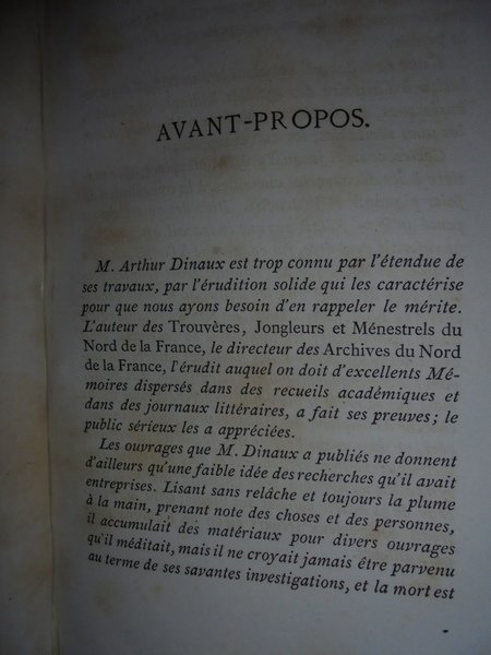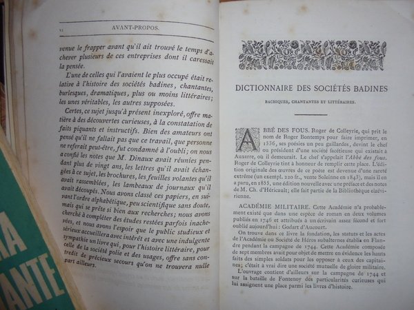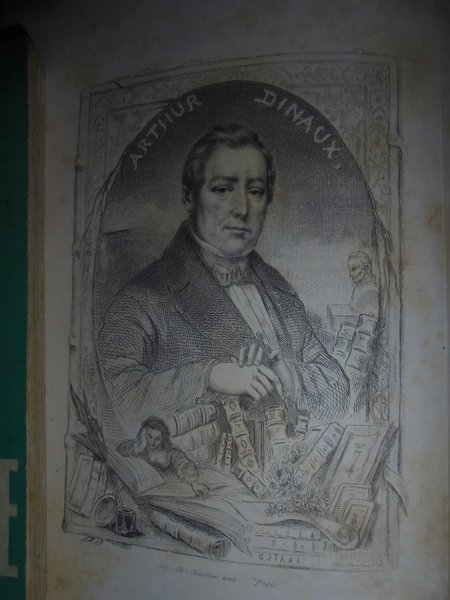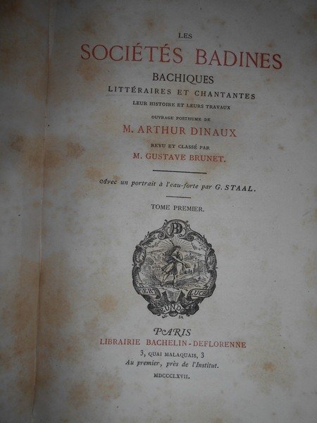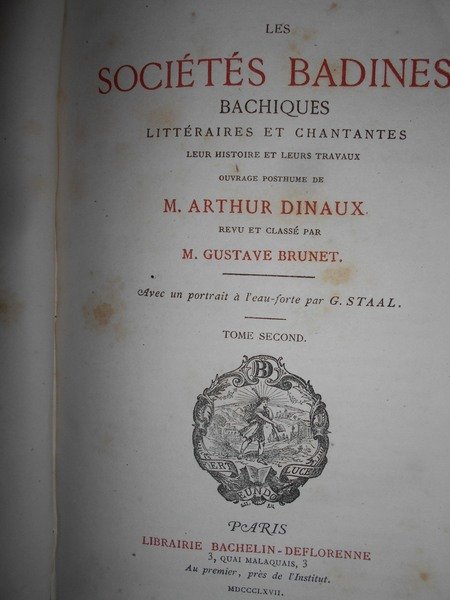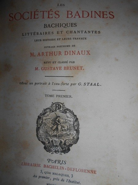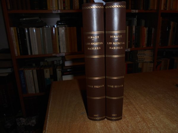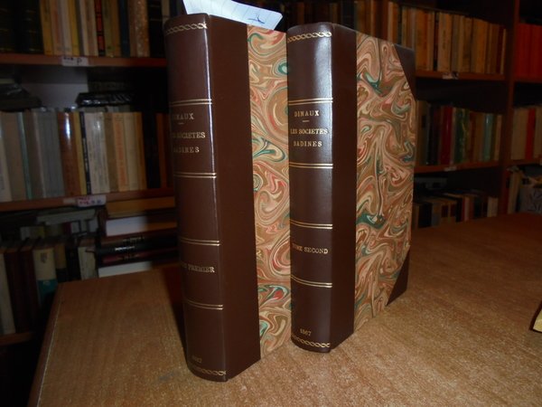 Arthur, Dinaux. Paris, Librairie Bachelin-Deflorenne, 1867. Les Sociétés Badines Chantantes et Litteraires leur histoire et leurs travaux. Ouvrage posthume revu et classé par M. Gustave Brunet. Edizione originale. 2 volumi in-8°, m. pelle con angoli, titolo e fregi in oro al dorso, copertine originali conservate. vi, 459 pp. avec un Portrait dessiné et gravé à l' eau-forte; 410 pp. Esemplare ben conservato. Uff. E - III - 3 - 2