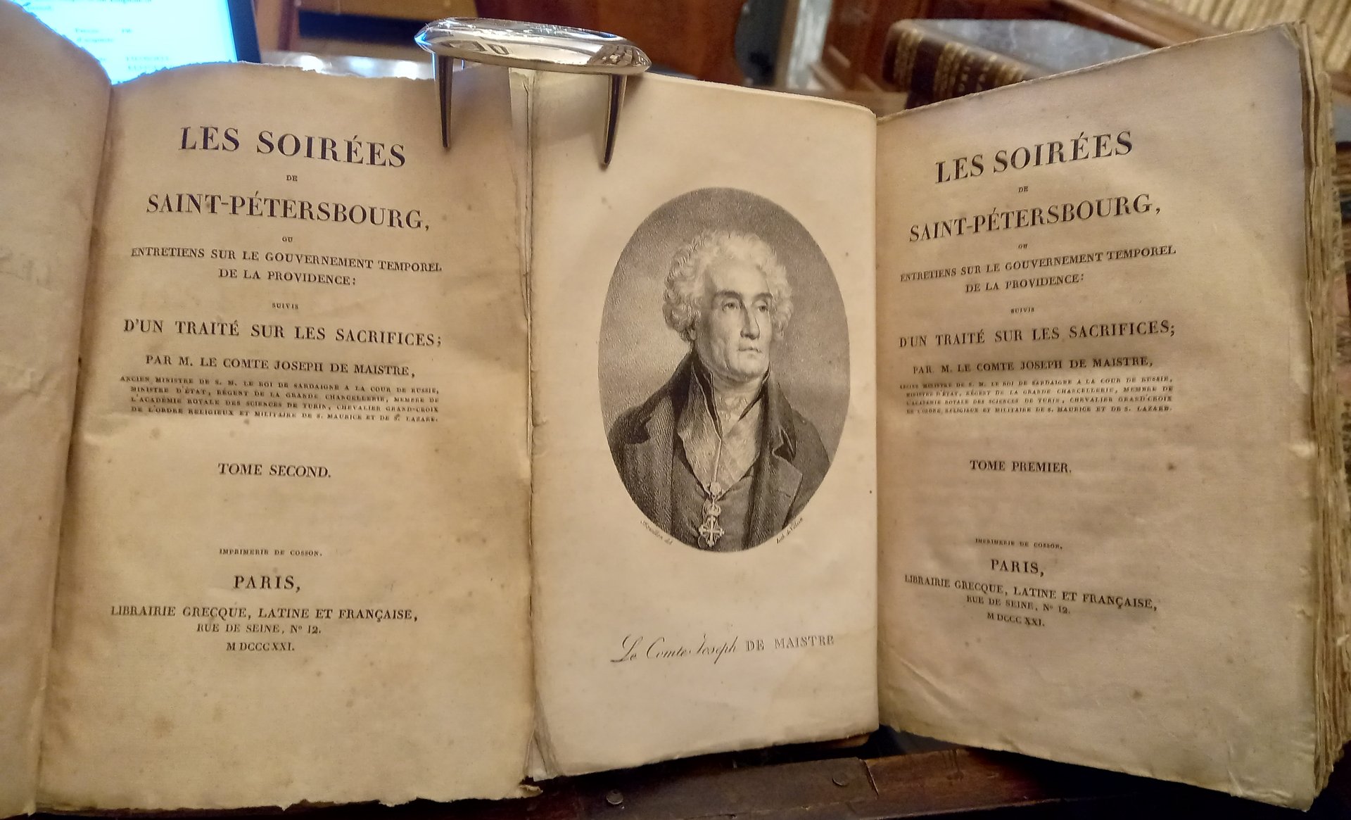In-8 (21 cm) (1) c. (ritratto) XXVI (4) 320, 351-456 (i.e. 556) (2); (4) 474 (2). Mezza pelle, piatti cartonati rivestiti di carta marmorizzata. Tassello al dorso con caratteri dorati. Litografia con ritratto dell'autore, in antiporta al primo volume, eseguito da Villain su disegno di Boullon. Con barbe. Il conte Joseph Marie de Maistre (Chambéry, 1º aprile 1753 – Torino, 26 febbraio 1821) è stato un filosofo, politico, diplomatico, scrittore, magistrato e giurista sabaudo di lingua francese, suddito del Regno di Sardegna, tra i più noti pensatori reazionari del periodo post-rivoluzionario. In-8 (21cm) (1) c. (portrait) XXVI (4) 320, 351-456 (i.e. 556) (2); (4) 474 (2). Half leather, hardcover plates covered with marbled paper. Back gusset with gold lettering. Count Joseph Marie de Maistre (Chambéry, 1 April 1753 - Turin, 26 February 1821) was a French-speaking Savoy philosopher, politician, diplomat, writer, magistrate and jurist, subject of the Kingdom of Sardinia, one of the best known reactionary thinkers of the post-revolutionary period. French language. Lingua francese