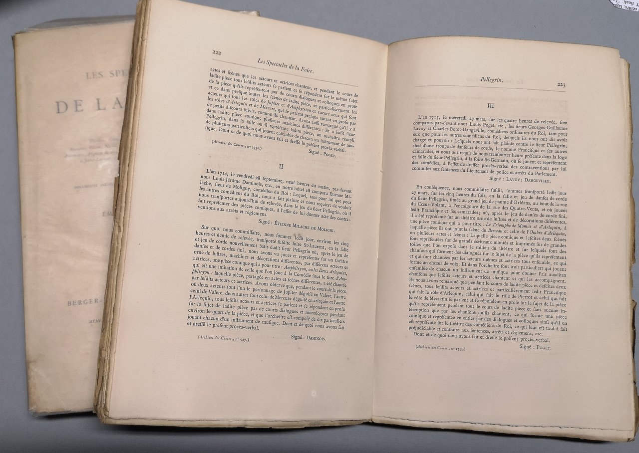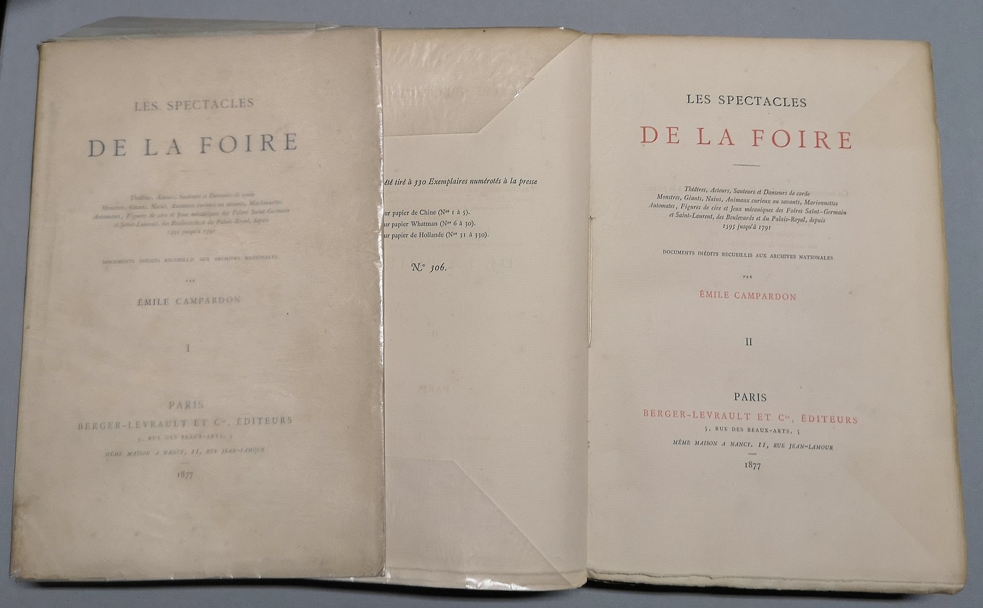 >2 vol. in-8, pp.XLVIII, 406, 512, broch. editoriale. Opera impressa con gran cura in soli 330 esemplari (num.31). Vasto straordinario e dettagliato studio su due secoli di spettacoli popolari a Parigi, in gran parte basato su documenti inediti degli Archives Nationales. Perfetto esemplare a pieni margini, raro.