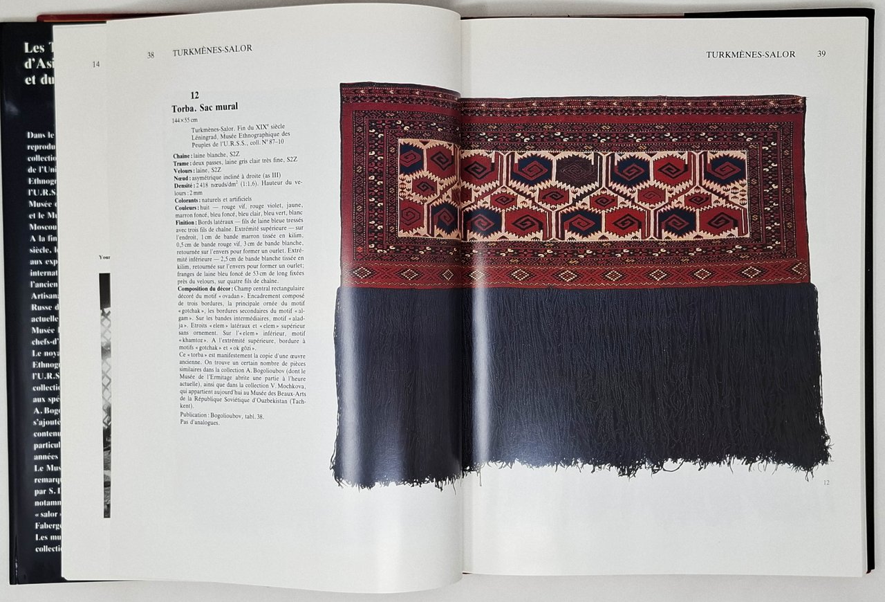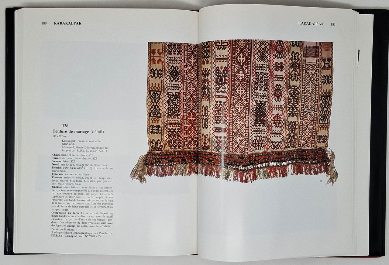 Réalisation et introduction d'Elena Tzareva. Traduction Francaise de Gabrielle de Groer. Presentation de Groer. Photographies de Valery Barnev. Lingua del testo: francese.Pagine: 224. Formato: 22,5 x 29,5 cm circa. Il volume riproduce i tappeti conservati nelle collezioni di quattro grandi musei dell'Unione Sovietica: musee Etnographique des Peuples de l'U.R.S.S. (Leningrad), Musee Russe (Leningrad), Musee de l'ermitage (Leningrad), musee des arts orientaux (Moscou).Ottimo esemplare. Copertina editoriale cartonata rigida in tutta tela con sovraccoperta illustrata a colori. Numerosissime illustrazioni fotografiche a colori e in nero nel testo.