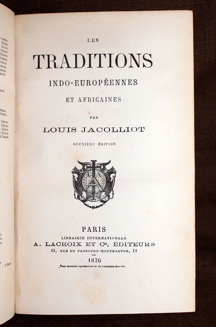 In -8, pp. (4) 324. Leg. dell’epoca mezza tela. Dorso con titoli oro. Seconda edizione. Ottimo esemplare. Saggio sulle tradizioni Indo-Europee, studiate attraverso la storia, i ceppi linguistici e la loro diffusione. Louis Jacolliot, console di Francia a Calcutta, proponeva, nelle sue opere, una versione della religione indo-ariana universale. L’India era il luogo d’origine del genere umano, e la Bibbia risaliva alle tradizioni dell’alta Asia.