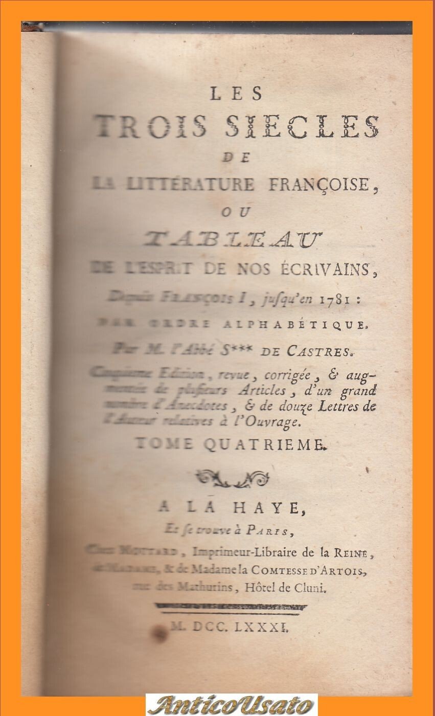 LES TROIS SIECLES DE LA LITTERATURE FRANCOISE Volume 4 di DE CASTRES 1781 Libro