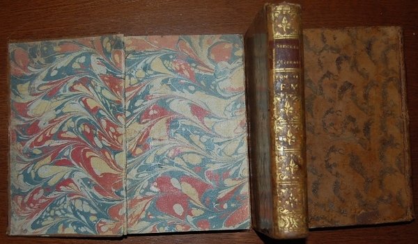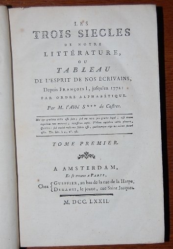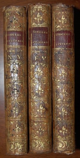 In 8° (19x11,4 cm); tre tomi: (6), XVI, 443, (3) pp., (6), 464, (2) pp., (6), 461 (ma i. e. 459), (1) pp. Belle legature coeve in piena pelle maculata con titolo e ricchi fregi in oro al dorso. Qualche strofinatura, spellatura e tre o quattro antichi forellini di tarlo. Piatti interni foderati da bella carta marmorizzata coeva. Quattro pagine con minima ed uniforme brunitura dovuta alla qualità della carta. Testatine, finalini ed iniziali xilografici. Prima edizione di questo noto dizionario biografico dedicato a tre secoli di letteratura francese compilato dal celebre uomo di lettere e giornalista francese "Antoine Sabatier dit labbé Sabatier de Castres, né à Castres le 13 avril 1742 et mort à Paris le 15 juin 1817". Protetto del grande Helvetius alla presa della Bastiglia emigrò in Germania per poi far ritorno con la Restaurazione. La sua fedeltà alla causa reale gli fece ottenere una pensione di 2000 franchi. Lopera qui presentata analizza autore per autore i grandi scrittori che hanno fatto la storia di Francia dal cinquecento alla fine del settecento rappresentando anche un buon repertorio bibliografico. Allinterno esemplare in buone-ottime condizioni di conservazione.