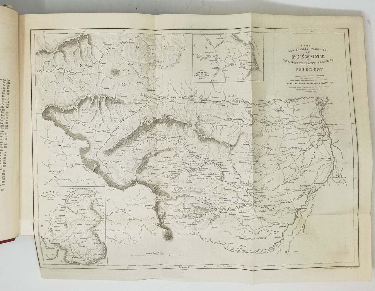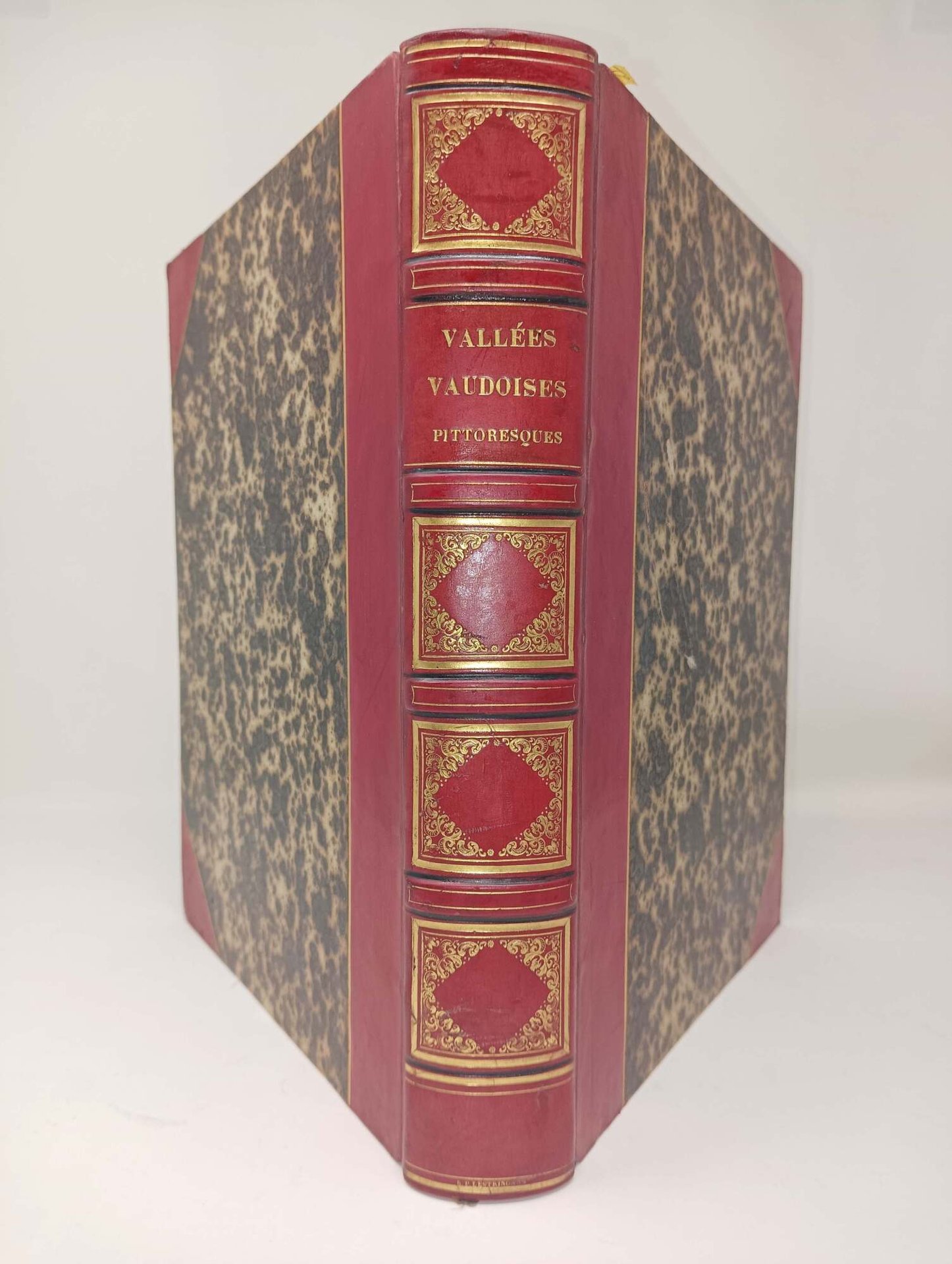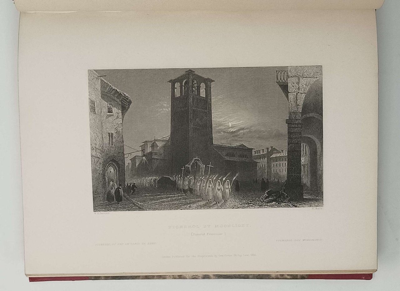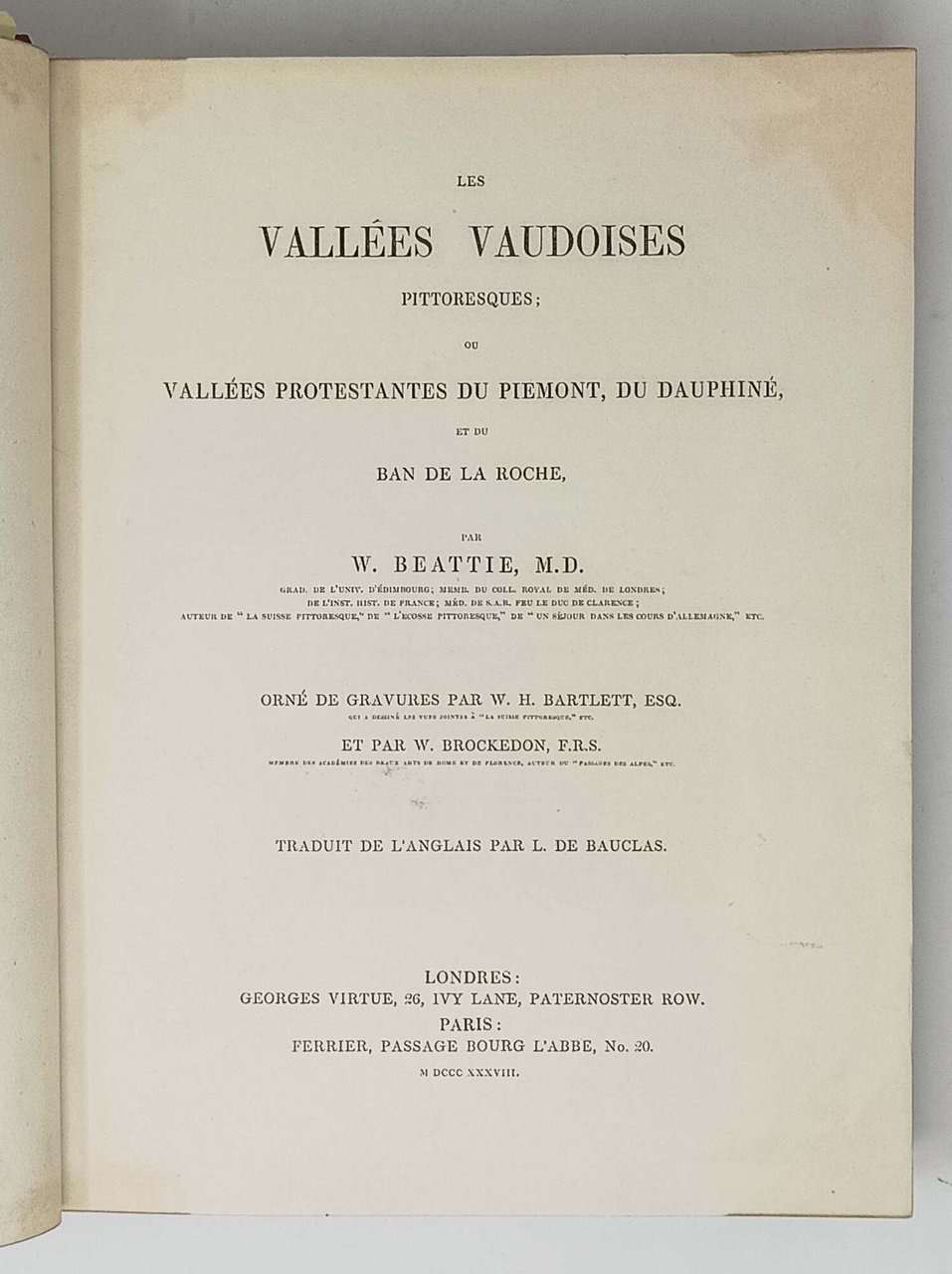>in-4, pp. VI, (2), 216, attraente legatura romantica in mezza pelle rossa e angoli, dorso a nervi con titolo e ricchi fregi oro negli scomparti. Dedica a stampa dell'autore al Re di Prussia Federico Guglielmo. Prima edizione in lingua francese, con le stesse illustrazioni dell'edizione originale inglese: ritratto del Beattie, frontespizio inciso con la veduta di Villar, una carta geografica delle Valli Valdesi ripiegata e 70 tavole f.t. (vedi scheda precedente). Splendido esemplare su carta grande, immacolato. Hugon-Gonnet n. 31. Perret 323. ACL 27.