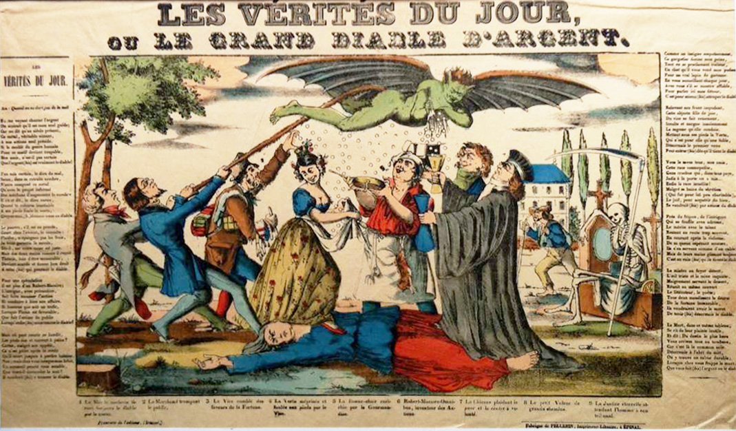Il tema dell'avidità umana, sempre tesa al guadagno e al denaro, ricorre frequentemente nelle stampe popolari francesi e italiane sin dalla fine del secolo XVIII con l'immagine del diavolo alato che dispensa monete a pioggia su un campionario di personaggi che vanno dal banchiere all'avvocato, dall'oste alla ''fille de joie'' e al mercante, mentre niente ottengono gli onesti pur sforzandosi di trattenerlo per la lunga coda, e la virtù giace a terra sopraffatta dal vizio. A destra, tuttavia, la morte attende tutti per dispensare la giustizia eterna. Di notevole interesse per la materia economica trattata.