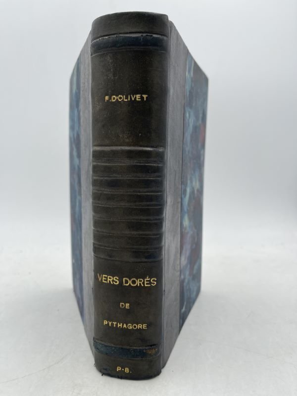 Lucien Bodin 1907 Paris, Lucien Bodin, 1907. Fort In-8 relié demi-basane bleue, titre doré, couverture conservée. 611 pages. Traduits en français et précédés d'un Discours sur l'essence et la forme de la poésie chez les principaux peuples de la terre par Fabre d'Olivet suivis des commentaires d'Hiéroclès sur les vers dorés de Pythagore. Fabre d'Olivet (1767-1825), écrivain, philosophe, et linguiste français, s'intéressait particulièrement aux mystères de la religion, de la philosophie ancienne et de l'occultisme. Dans son interprétation des Vers dorés, il chercha à restaurer ce qu'il considérait être l'esprit originel de la philosophie pythagoricienne, en ajoutant une dimension ésotérique et symbolique à chaque vers. Selon Fabre d'Olivet, la pensée de Pythagore dépasse la simple éthique pour englober une compréhension profonde des lois cosmiques et spirituelles. Bon exemplaire