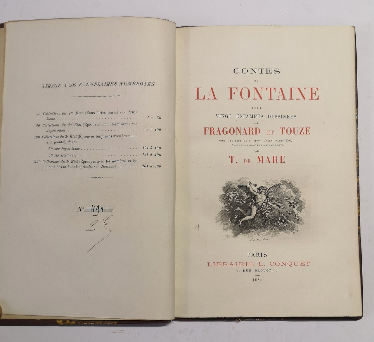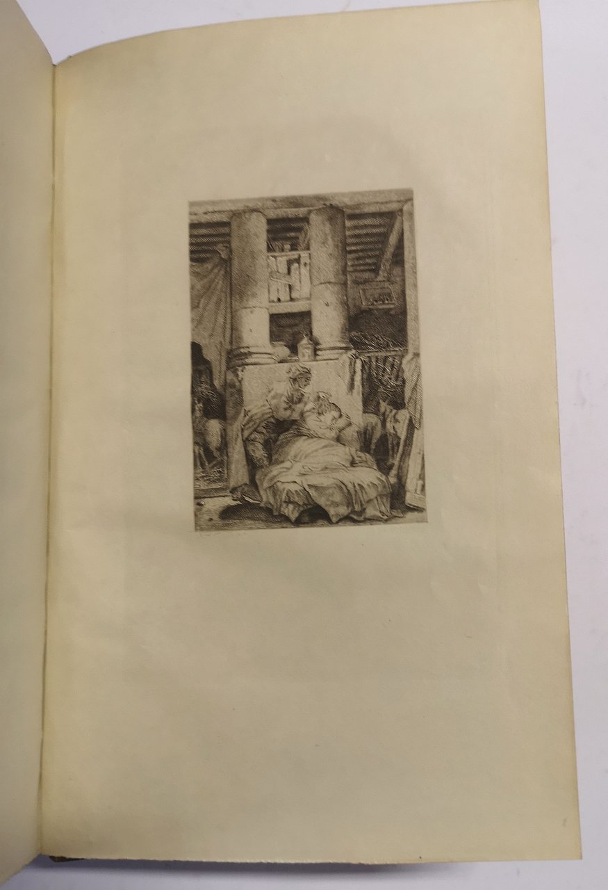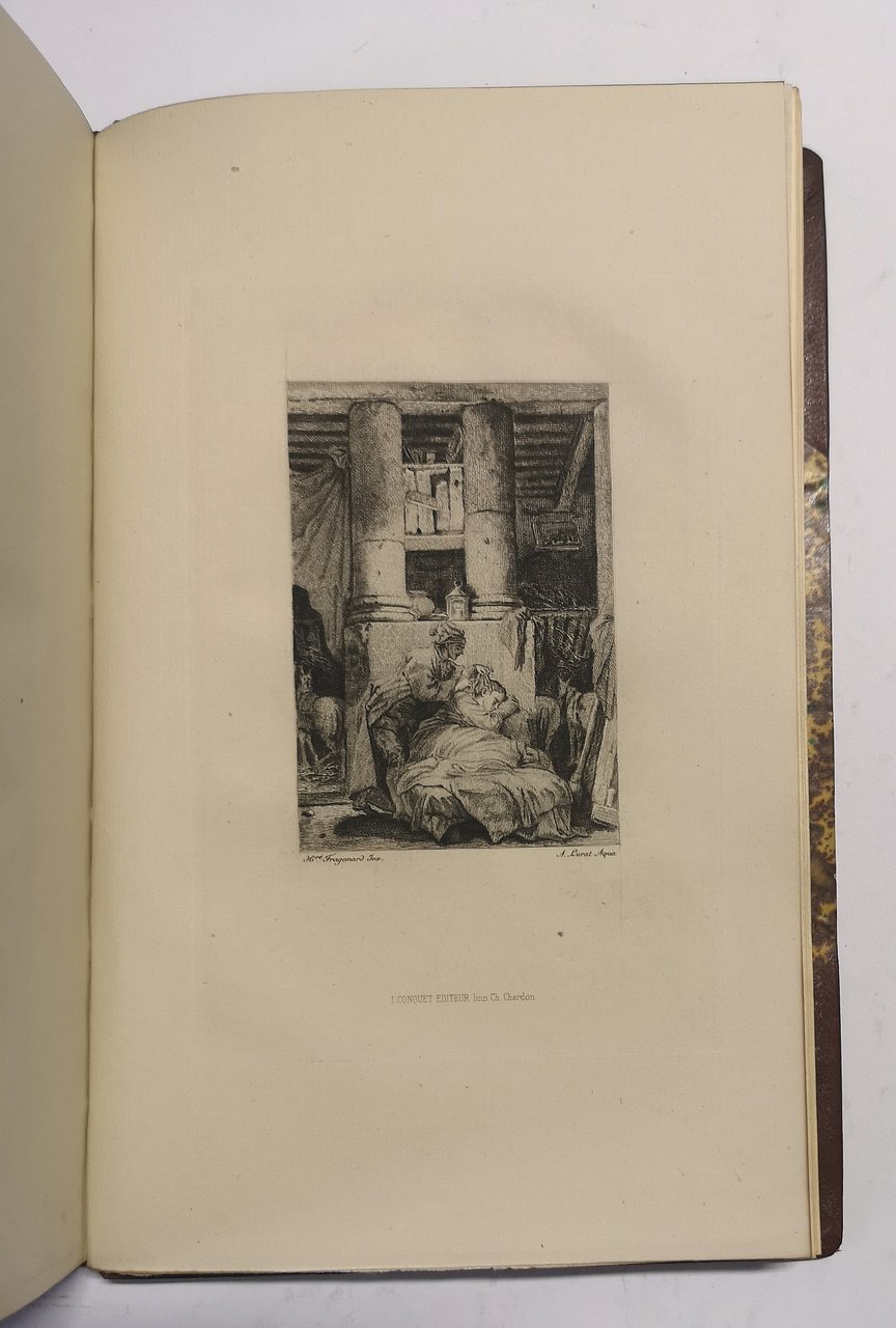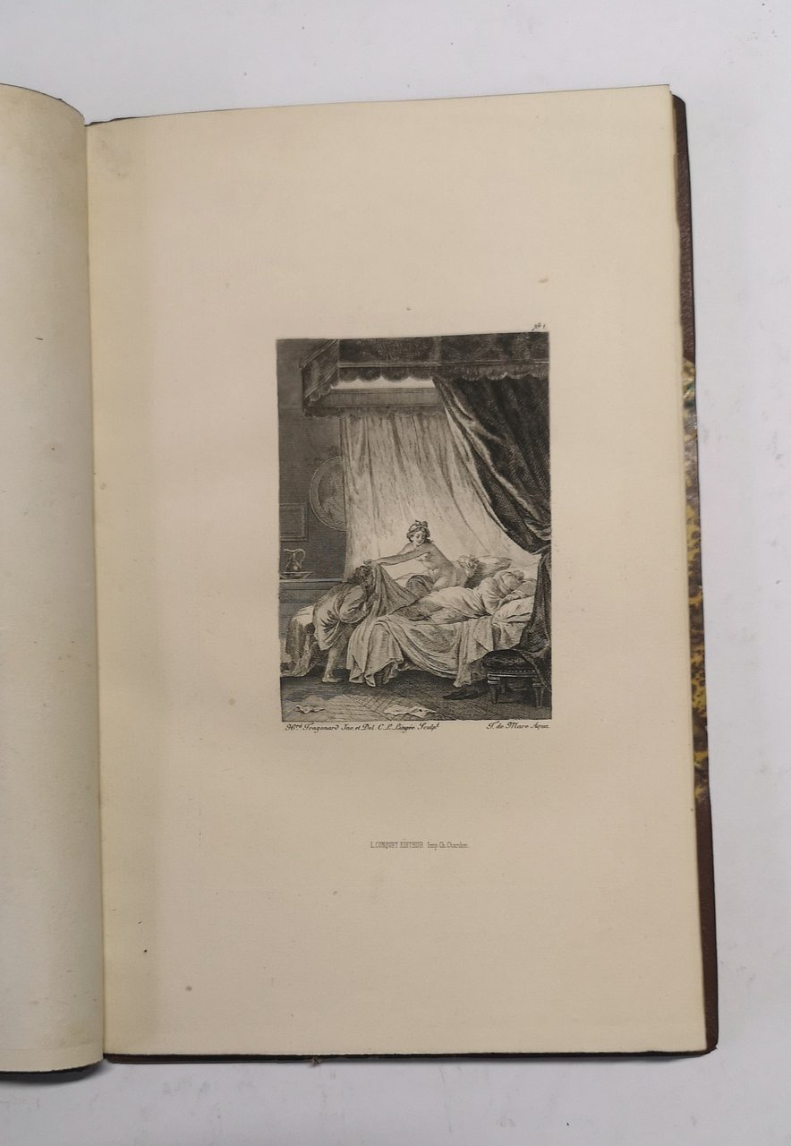 >in-8, pp. (4), vignetta incisa sul frontespizio con titoli in rosso e nero, 1 ritratto di Honore Fragonard, 20 tavole incise da Fragonard e numerate, 3 tavole incise da Fragonard, non numerate, e 3 non firmate. Leg. mezzo marocchino ed angoli, titolo oro e fregi al dorso a nervi. L'opera fu impressa in 500 esemplari numerati, il nostro, n. 491, fa parte delle 300 Collections di 4 état (épreuves avec les numéros et les noms des artistes imprimés) sur Hollande. Oltre alle 20 tavole in 4 stato dichiarate, nel presente esemplare sono state legate anche 3 tavole in terzo stato (épreuves terminées avec les noms à la pointe) sur Hollande e 3 tavole, medesimo soggetto delle precedenti, in 1 stato (eaux-fortes pures) sur Japon blanc. Preziosa edizione, priva di testo ma con le belle tavole protette da velina, "Très belle publication" (cfr. Bibliographie des ouvrages illustrés du XIXe siècle, p.248). Perfetto esemplare, in elegante legatura ed in perfetto stato di conservazione. Bibliographie des ouvrages illustrés du XIXe siècle, p.248; Vicaire IV, 919.