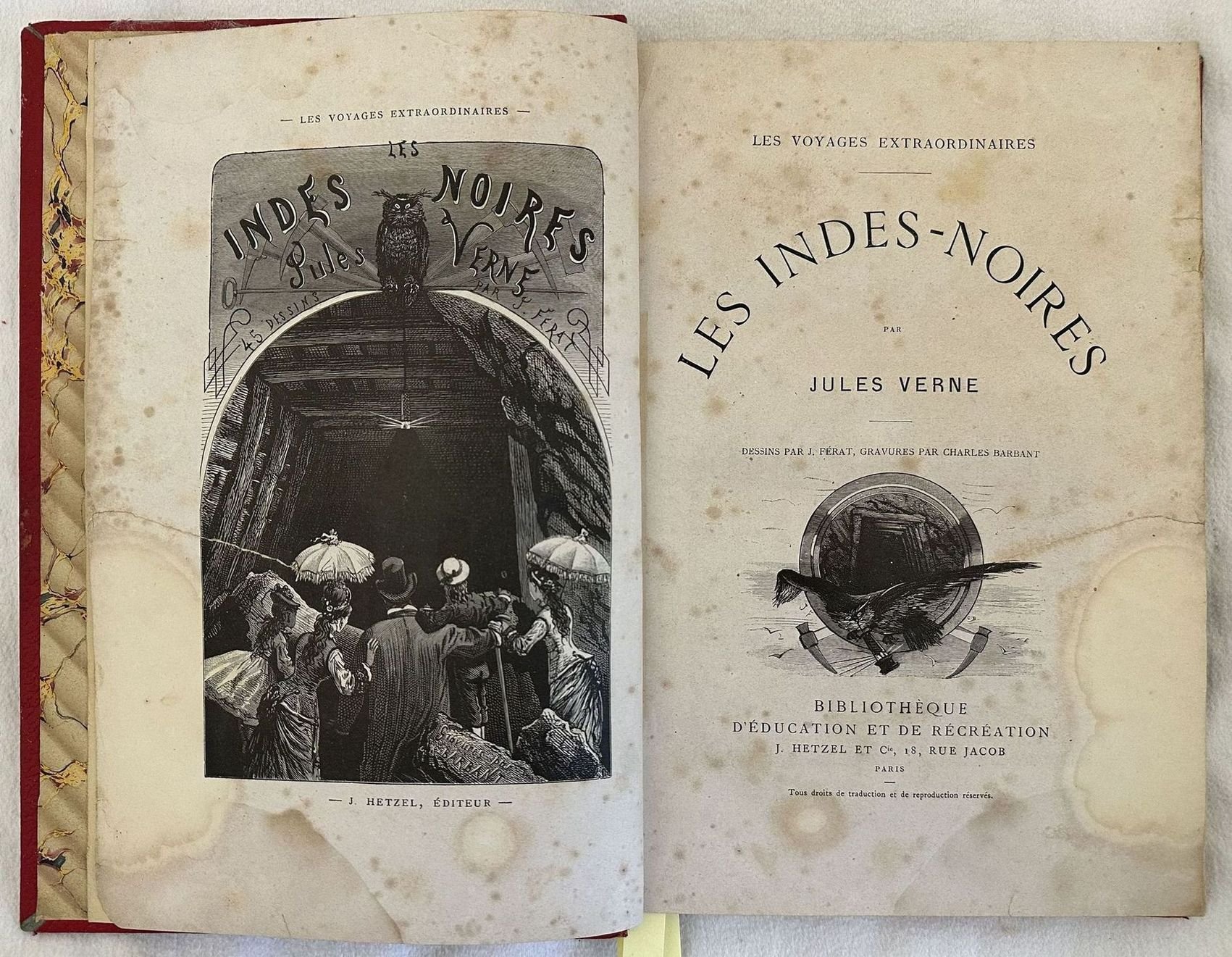 Edizione di fine ottocento di questo romanzo di avventura dello scrittore Jules Verne (1828-1905). L'opera venne pubblicato per la prima volta a puntate nel 1877. Numerose illustrazioni nel testo incise da Charles Barbant su disegno di J. Ferat. Antiporta illustrata. In buone condizioni. Copertina in mezza pelle muta in buone condizioni generali con lievi usure ai margin e dorso. Legatura in buone condizioni. All'interno le pagine si presentano in buone condizioni con rare fioriture. Strappo riparato in antiporta. In 4. Dim. 28x19 cm. Pp. 173+(1). Edition of late 19th century of the famous novel of adevnture by the writer Jules Verne (1828-1905). The work was published for the first time in 1877. Different illustrations in the text engraved by Charles Barbant after J. FErat. Illustrated frontspice. In good conditions. Half leather cover in good general conditions lightly worn in the extremities. Binding in good conditions. Pages in good conditions with occasional foxing. Tear repaired in the frontspice. In 4. Dim. 28x19 cm. Pp. 173+(1)