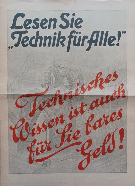 Die großformatige Broschüre bewarb die Zeitschrift "Technik für alle". Die Werbepublikation wurde überaus aufwändig gestaltet. Sie enthält eine Illustration auf dem Deckel (Signatur im Bild: Jacobs) und zahlreiche Abbildungen im Inneren. Geworben wird mit einem Gewinn beim Leser durch das Wissen um die zeitgenössische technische Entwicklung in einem breiten Spektrum. Die letzte Seite enthält zudem eine noch unbenutzte Original-Beitrittserklärung zum Leserbund der Zeitschrift. Historische Verlagswerbung aus den 1920er Jahren!