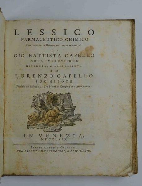 Lessico farmaceutico-chimico contente li rimedj più usati d’oggidì... Nona impressione riveduta, e accresciuta da Lorenzo Capello suo nipote, Speziale all’Insegna de' Tre Monti in Campo di Sant'Apollinare.