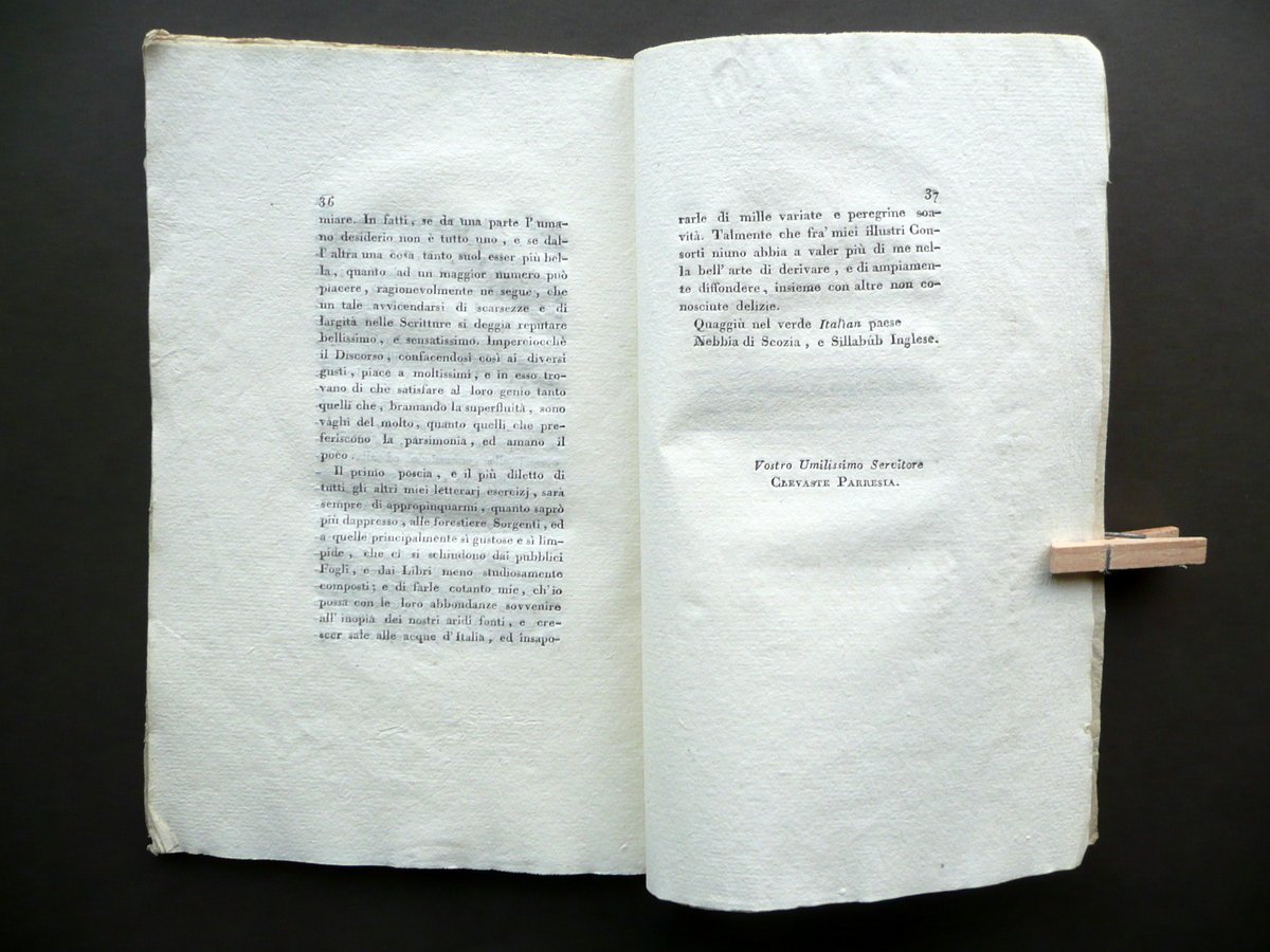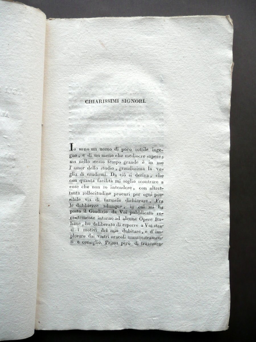 Anonimo (Giovanni Paradisi - Luigi Lamberti - Urbano Lampredi), Lettera agli autori di un giudizio sopra alcune opere italiane Dalla Tipografia Silvestri, Milano 1811, cm 21,5x14, pp. 40; legatura coeva in cartoncino con alcune annotazioni d'epoca a penna (indicazioni di distanze). Condizioni di conservazione Esemplare complessivamente ben conservato con tracce d'uso e leggeri segni del tempo, legatura con alcune minuscole bruniture, lievi tracce di sporco e qualche leggerissima macchietta rossa (vedi foto). Interni buoni con pochissimi poco visibili aloni. Raro opusolo realizzato a pi√π mani da G. Paradisi, L. Lamberti e U. Lampredi (opuscolo pubblicato in forma anonima). OPEB.3033 N