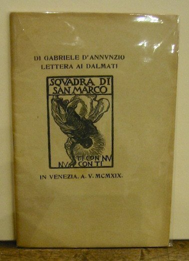 16mo (cm. 17), 43(1) pp., 2 cc.nn. Copertina bianca della stessa carta del testo con al centro l’impresa ‘Squadra di San Marco. Ti con nu, nu con ti’, ripetuta al frontespizio. Altre incisioni con imprese dannunziane nel testo. Sulla cop. posteriore impresa ‘Primo gruppo di squadriglie’. Ottimo esemplare. De Medici, 96; Guabello, 229; Vecchioni, 58.