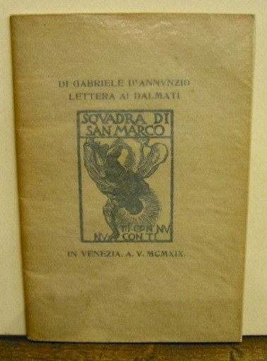 16mo (cm. 16,5), 43(1) pp., 2 cc.nn. Copertina bianca della stessa carta del testo con al centro l’impresa ‘Squadra di San Marco. Ti con nu, nu con ti’, ripetuta al frontespizio. Altre incisioni con imprese dannunziane nel testo. Sulla cop. posteriore impresa ‘Primo gruppo di squadriglie’. Ottimo esemplare. De Medici, 96; Guabello, 229; Vecchioni, 58.