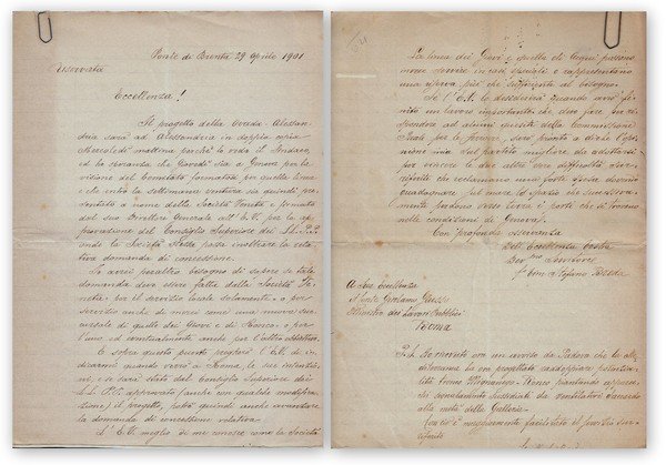 lettera manoscritta e firmata dall'Ing. Stefano Breda di 8 pp. datata Ponte di Brenta 29 Aprile 1901 al Ministro dei Lavori Pubblici Conte Girolamo Giusso dove espone a nome della Società Veneta il progetto della costruzione della Ferrovia Ovada - Alessandria, con vantaggi, svantaggi, dati e benefici per lo stato; buon es.