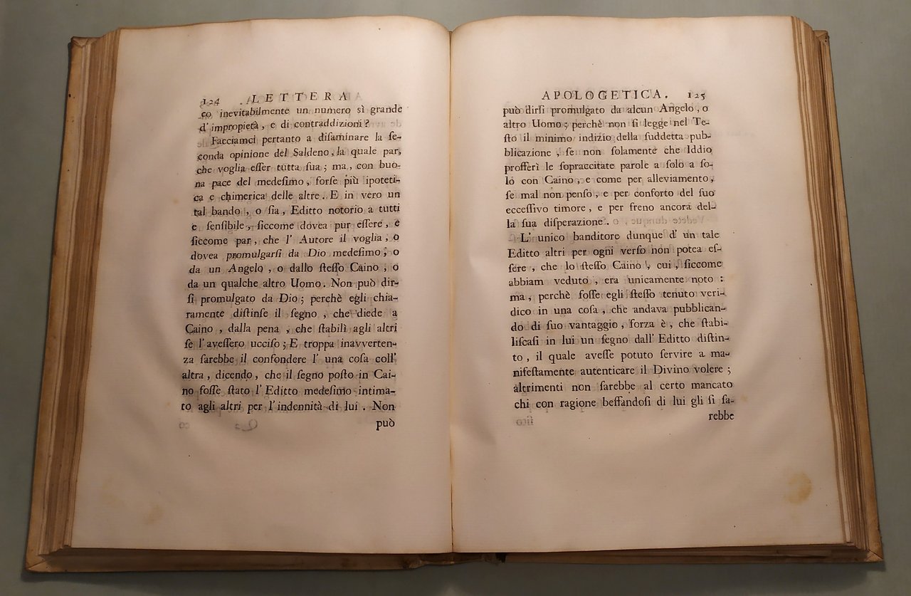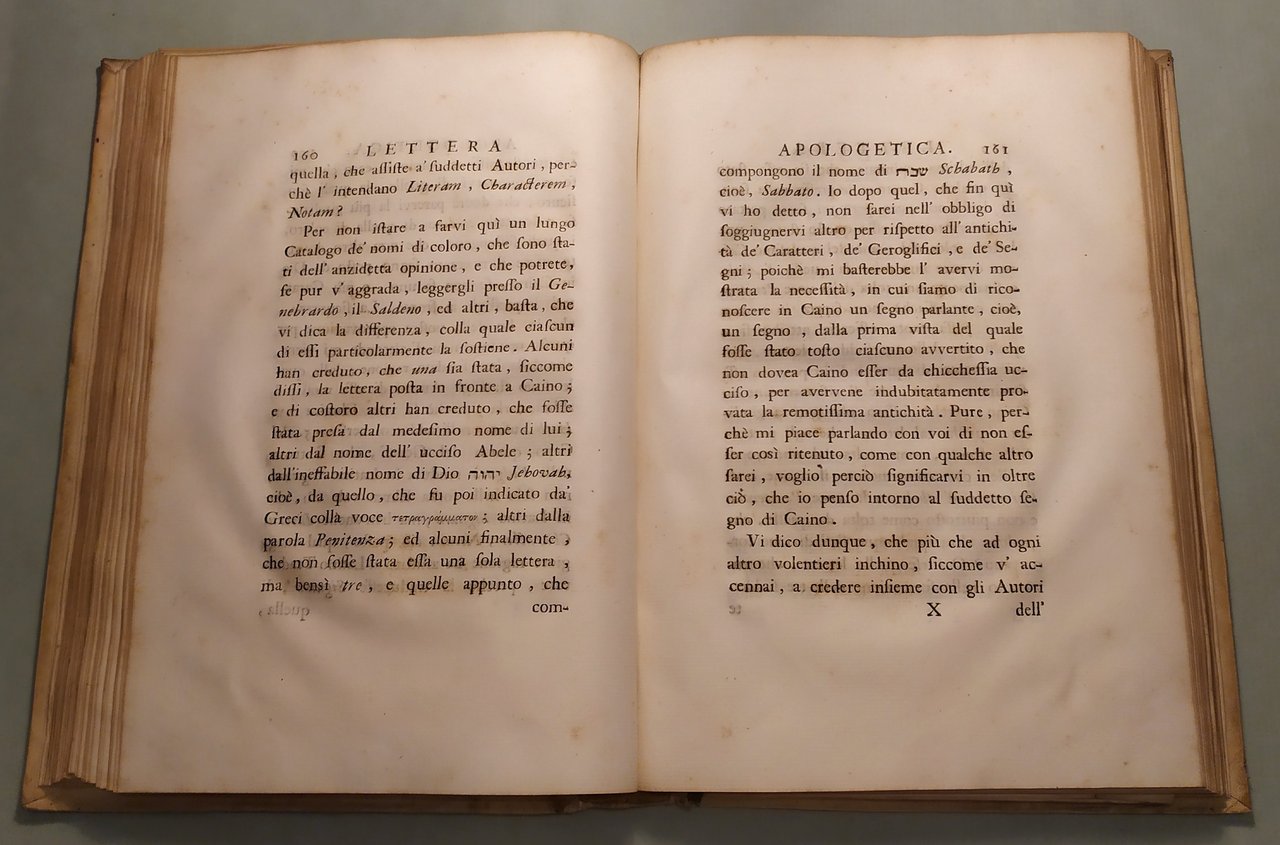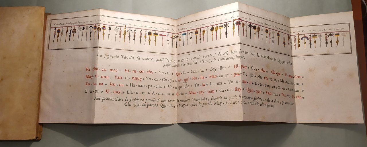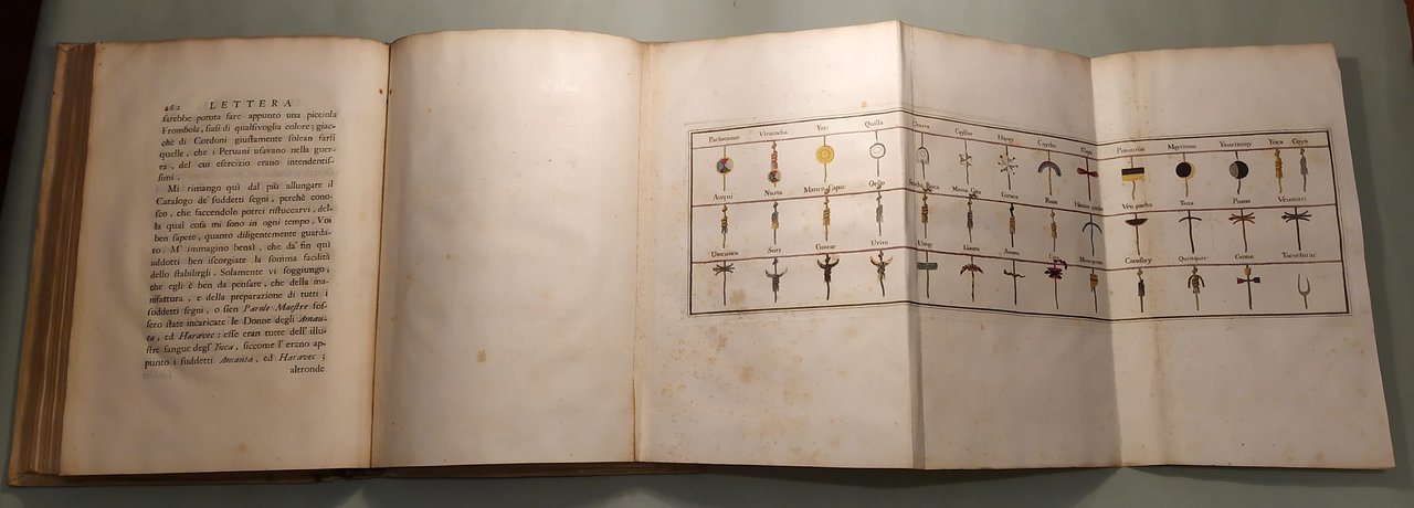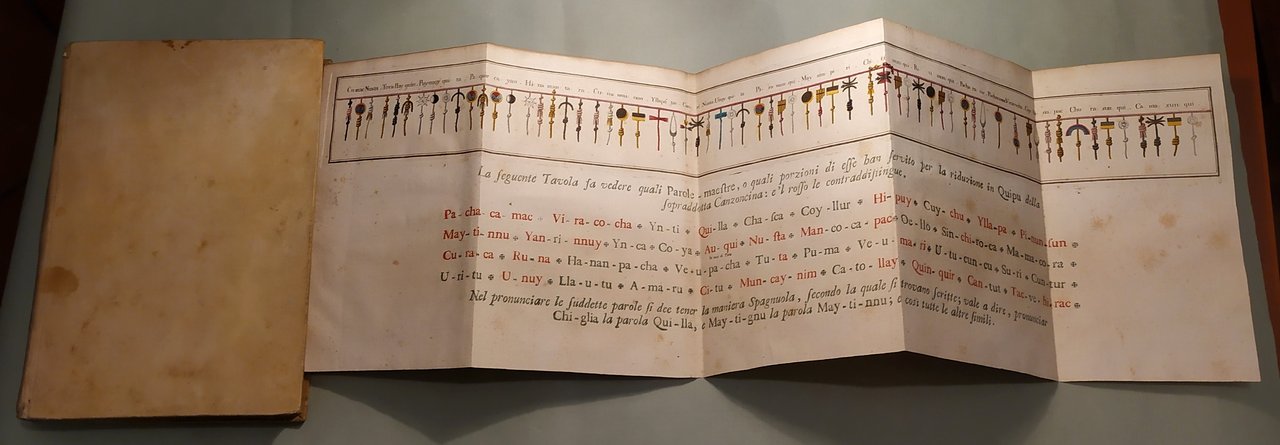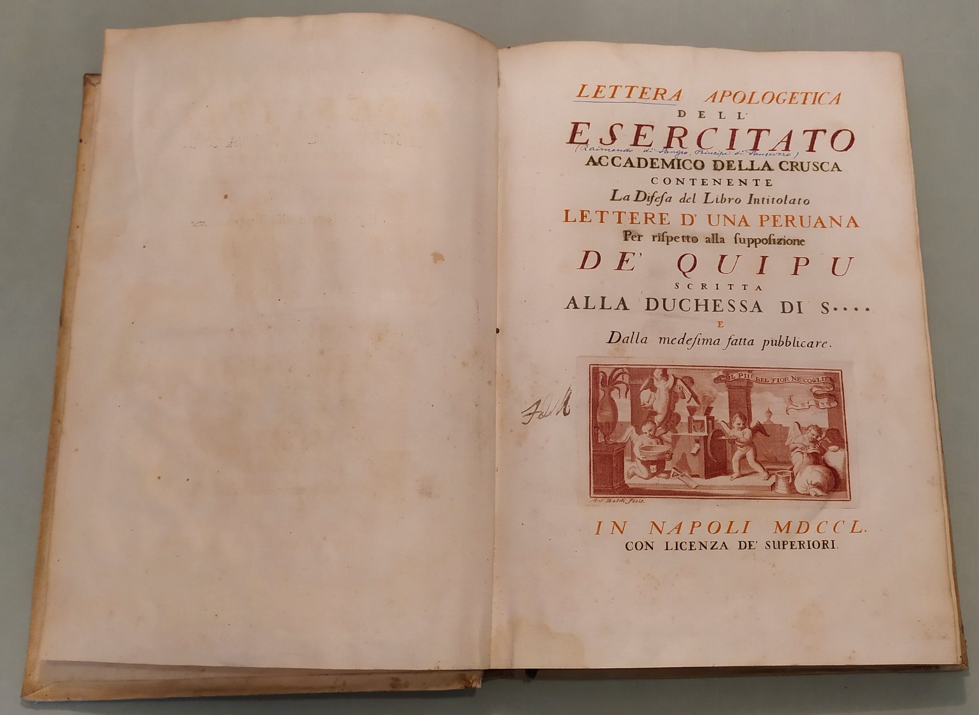 In Napoli, 1750. In 4to; pp.14n.nn., 320, 14n.nn. 3 grandi tavole spieghevoli con coloritura coeva. Pergamena coeva, tassello con titolo e fregi in oro, lacerazioni al dorso. “Dalla stamperia privata del principe di Sansevero uscì all’inizio del 1751 – ma il frontespizio reca la data dell’anno precedente – un libro che destò meraviglia e sconcerto, tanto per l’eccezionalità tipografica quanto per il caleidoscopico contenuto. Ne era autore lo stesso Raimondo di Sangro, che lo pubblicò con l’approvazione della Crusca e il suo nome da accademico, intitolandolo Lettera Apologetica dell’Esercitato Accademico della Crusca contenente la Difesa del libro intitolato Lettere d’una Peruana per rispetto alla supposizione de’ Quipu scritta alla Duchessa di S**** e dalla medesima fatta pubblicare (Napoli 1750). Formalmente, la Lettera di Sansevero si presentava come una divertita apologia dell’efficacia di un antico sistema comunicativo in uso presso gli Incas del Perù, indirizzata a una duchessa amica, e composta traendo occasione dalla recente uscita, a Parigi, delle Lettres d’une péruvienne (1747) di Françoise de Graffigny, un romanzo epistolare di gusto esotizzante la cui protagonista, a detta dell’autrice, aveva redatto con i Quipu alcune delle sue missive. In realtà, i nodi fatti con cordicelle variamente colorate, denominati appunto quipu, di cui la civiltà precolombiana si era servita per registrare conti o avvenimenti, costituivano per Raimondo di Sangro il pretesto per toccare ben altri argomenti. In quest’opera dalla struttura complessa – fitta di note, rimandi, citazioni – Sansevero propagandava il verbo panteistico rielaborato attraverso le opere di John Toland, la necessità del libero pensiero, teorie poco ortodosse sull’origine del mondo, dell’uomo e della scrittura, l’ostilità all’ingerenza della Chiesa e all’introduzione del Tribunale dell’Inquisizione nel Regno di Napoli. Non solo: i suoi contemporanei crederono di trovare espressi tra le righe della Lettera Apologetica gli intenti civili e i fermenti innovativi della Massoneria, rinvii alla tradizione cabalistica, perfino messaggi esoterici veicolati attraverso un “maligno gergo”. Citando Bayle, d’Argens, Swift, Pope, Voltaire, deisti inglesi ed esponenti del cosiddetto Illuminismo radicale, di Sangro si collocava inequivocabilmente nel solco della cultura europea antitradizionale. Quanto alla veste tipografica, il frontespizio della Apologetica presenta una particolarità impensabile per l’epoca: è infatti stampato in quattro colori e con una sola pressione di torchio, grazie a una tecnica perfezionata dal di Sangro, che volle così dare a tutti un saggio di questa sua – come la definì Lorenzo Giustiniani nel 1793 – “nuova sorprendente invenzione”. Al testo sono poi allegate tre bellissime tavole ripieghevoli: nella prima, il principe elabora graficamente i segni principali, o “Parole Maestre”, dell’antica lingua incaica, quali Dio, Notte, Acqua, Sole e altri; nella seconda traduce addirittura in quipu una canzoncina peruviana; nell’ultima dimostra magistralmente la possibilità di traslitterare in quipu gli alfabeti latino, italiano, francese, spagnolo, tedesco e inglese. Non bastò però il pregio della stampa a distrarre i censori romani della Congregazione dell’Indice dei libri proibiti, che condannarono l’opera il 29 febbraio 1752 in quanto infetta da “atra peste”, e confermarono la proibizione nel 1754, dopo che l’autore aveva cercato – con l’invio di una Supplica al pontefice – di giustificare le tesi espresse nell’Apologetica, sostenendo fossero state scritte all’insegna dell’ironia. La reazione al libro non venne solo dalla Santa Sede: anche i gesuiti Pasquale De Mattei e Innocenzo Molinari lo attaccarono duramente, ritenendolo “una sentina di tutte l’eresie”. Così, con la pubblicazione della Lettera Apologetica, andò consolidandosi e diffondendosi la fama da intellettuale eterodosso di Raimondo di Sangro, che lo accompagnò tutta la vita, e lo avrebbe accompagnato per sempre”. museosansevero.it/lettera-apologetica/
