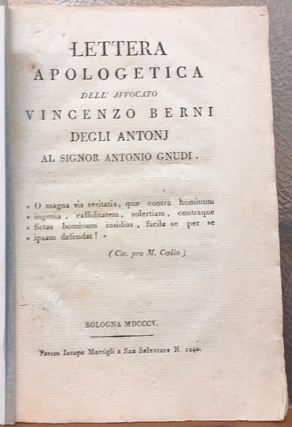 LETTERA APOLOGETICA DELL'AVVOCATO VINCENZO BERNI DEGLI ANTONJ AL SIGNOR GNUDI.