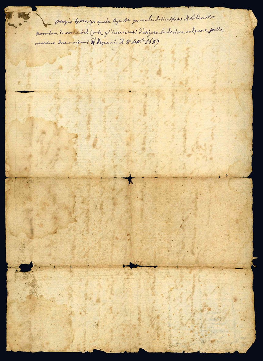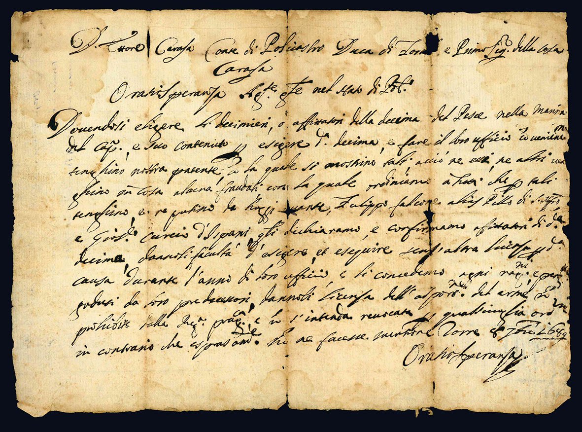 Foglio volante manoscritto (mm 273x196). Con la presente l'agente generale nominava, in nome di Ettore Carafa, Conte di Policastro, gli incaricati a riscuotere la decima sul pesce. Carta uniformemente brunita, aloni diffusi, mancanze in corrispondenza delle piegature. Al verso note posteriori relative al contenuto del documento.