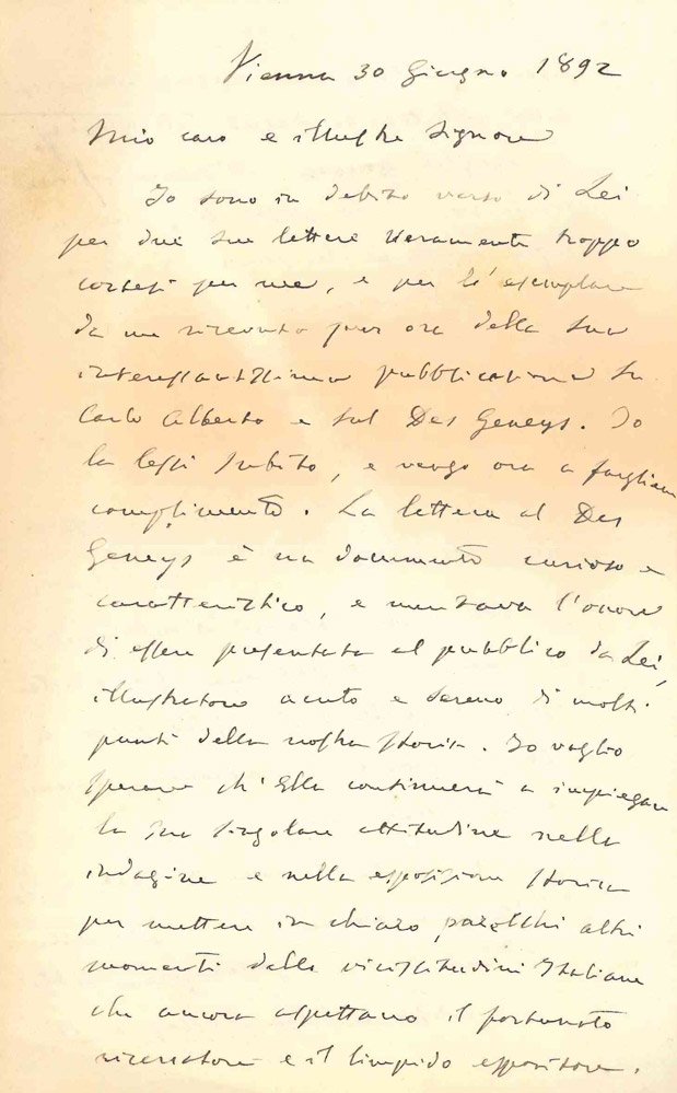 AUTOGRAFOLettera autografa firmata. Non indicato il destinatario: si tratta però di Paolo Boselli, come si desume dal contenuto della missiva. Il documento proviene da un insieme di carte a lui appartenute. Ottime condizioni di conservazione.Costantino Nigra, grande diplomatico con ruoli di primo piano nella politica estera italiana del secondo Ottocento (dal 1890 fu senatore del Regno), scrive a Paolo Boselli per complimentarsi della pubblicazione del volume «Carlo Alberto e l'ammiraglio Des Geneys nel 1821», stampato a Torino nel 1892 presso Carlo Clausen: «La lettera del Des Geneys è un documento curioso e caratteristico, e meritava l'onore di essere presentata al pubblico da lei, illustratore acuto e severo di molti punti della nostra storia. [.]». Nigra coglie inoltre l'occasione per inviare a Boselli una copia della sua «Rassegna di Novara», nella speranza di essere citato in una seconda edizione dell'opera di Boselli: «io mi permetto di mandarle un esemplare della 2a edizione della Rassegna di Novara, nella quale ho tentato di resuscitare nella sua tragica apoteosi la figura di Carlo Alberto [.]. Forse in una seconda edizione del suo lavoro, il mio modesto nome troverà luogo daccanto, o più veramente dopo, quelli del Prati e del Carducci».