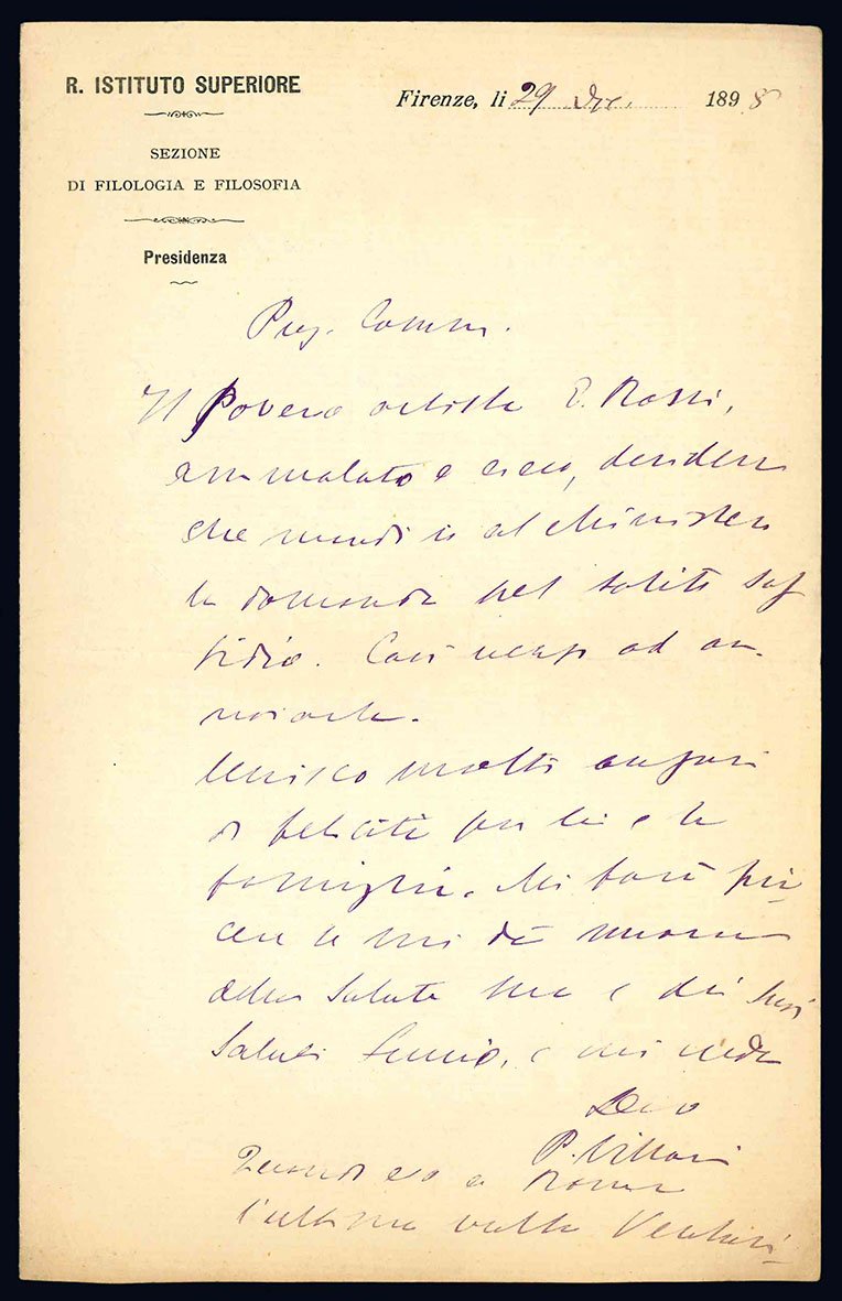Bifolio manoscritto autografo (mm 210x134) su carta intestata: “R. Istituto Superiore Sezione di Filologia e Filosofia. Presidenza”, nel quale si cita il “…povero artista P. Rossi…”. Bianca la seconda carta.