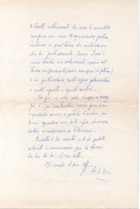AUTOGRAFODocumento autografo originale.Curiosa lettera scritta in merito all'invio di un volume che il suo corrispondente chiede. Si legge tra l'altro: «[.] molto volentieri scriverei all'editore Flaccovio di Palermo per ottenerle uno sconto sul costo del mio volume Il Trionfo della morte. Ma non posso nemmeno mandargli un saluto, tant'è imbestialito contro di me che lo costrinsi a mandare circa 50 omaggi del volume ai critici e storici d'arte senza che alcuno lo degnasse d'un ringraziamento o d'una recensione [.]».