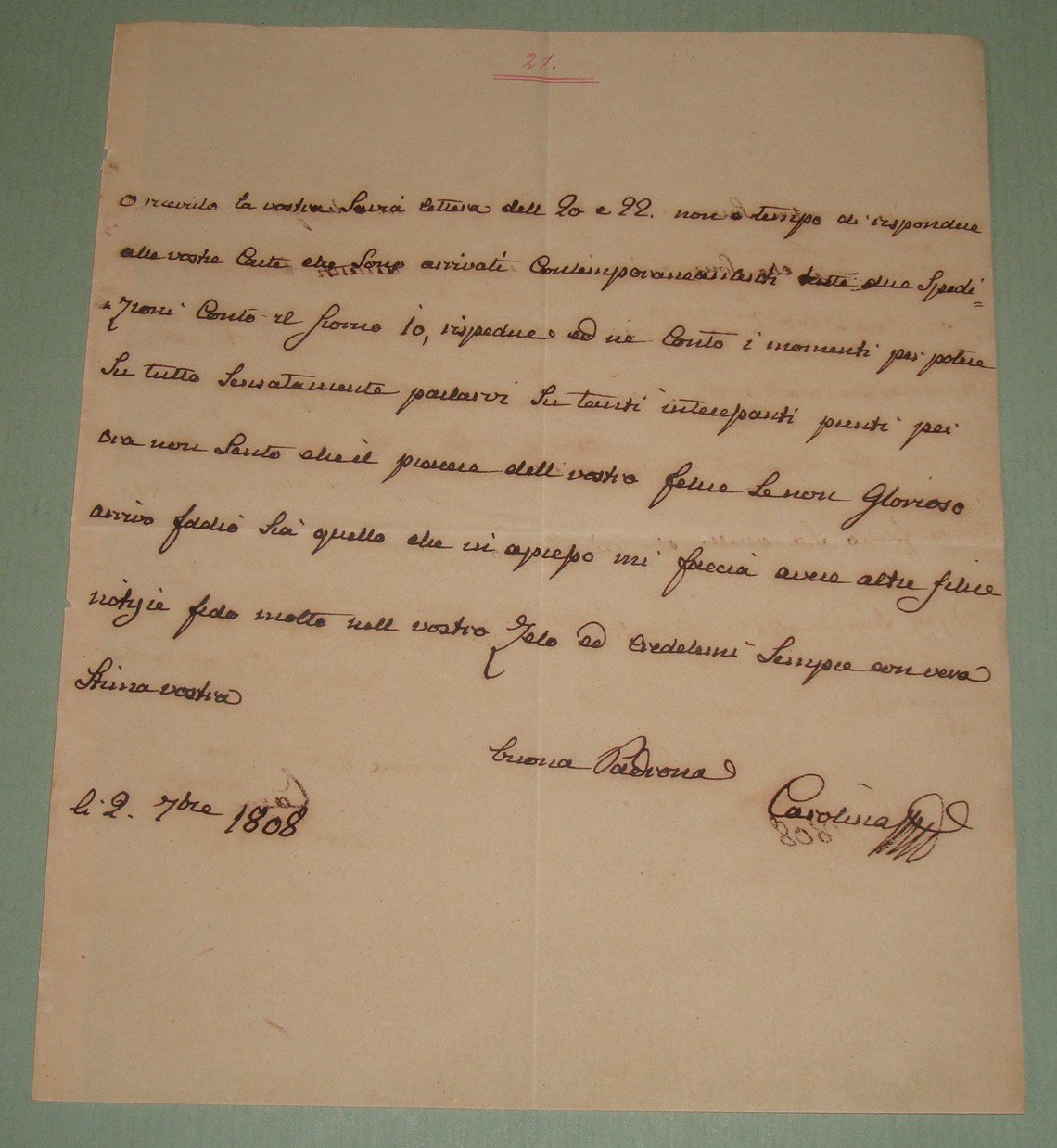 Maria Carolina d'Asburgo - Lorena (Vienna, 13 agosto 1752 – Vienna, 8 settembre 1814) fu regina consorte di Napoli e Sicilia come moglie di Ferdinando IV di Napoli e III di Sicilia. Lettera autografa firmata datata 2 Ottobre 1808 indirizzata al Marchese Tomasi. Una pagina cm.23x19. "… Conto i momenti per poter su tutto sensatamente parlarvi su tanti interessanti quesiti …" e si firma “vostra buona Padrona Carolina”.