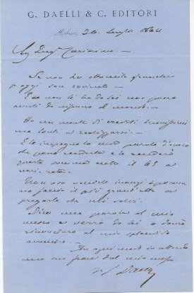 - 1 carta scritta al recto. Carta azzurra intestata G. Daelli & C. Editori,