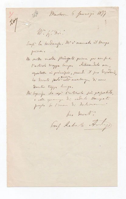 AUTOGRAFO210x130 mm. Manoscritto a inchiostro nero. Un piccolo foro al margine superiore destro senza perdita di testo. Ardigò parla di un suo articolo e dei tagli che ha dovuto apporvi perché non risultasse troppo lungo. “[.] mi lusingo che così l’articolo sia passabile, e nella speranza di vederlo stampato presto [.].