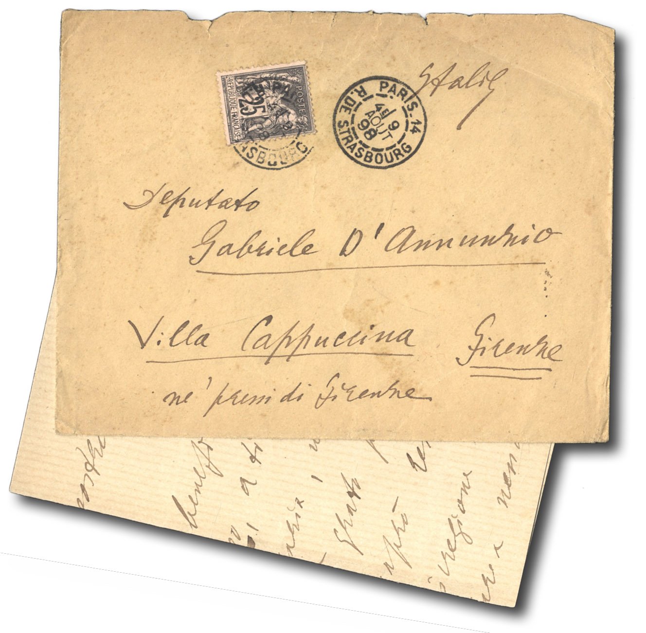 >3 pagine in-8, conservata busta con indirizzo di D'Annunzio a Firenze: ''Villa Cappuccina ne' pressi di Firenze'' (l'antica villa dei Capponi, la Capponcina, sulla collina di Settignano nei pressi di Firenze, venne affittata da d'Annunzio nel marzo del 1898 per avvicinarsi all'attiguo villino della Portiuncola, dove la Duse viveva da alcuni mesi). Il celebre critico Antona Traversi scrive a D'Annunzio, chiamandolo ''Pur illustre'', dal suo confino parigino: fu infatti costretto ad emigrare per evitare un mandato di cattura poichè rimase coinvolto in un processo per cambiali false. Nella missiva confida la difficile situazione economica, chiede denaro a d'Annunzio e gli comunica il suo indirizzo a Parigi. ''...soffro immensamente per la malvagità altrui. Trovami in miseria...'' :