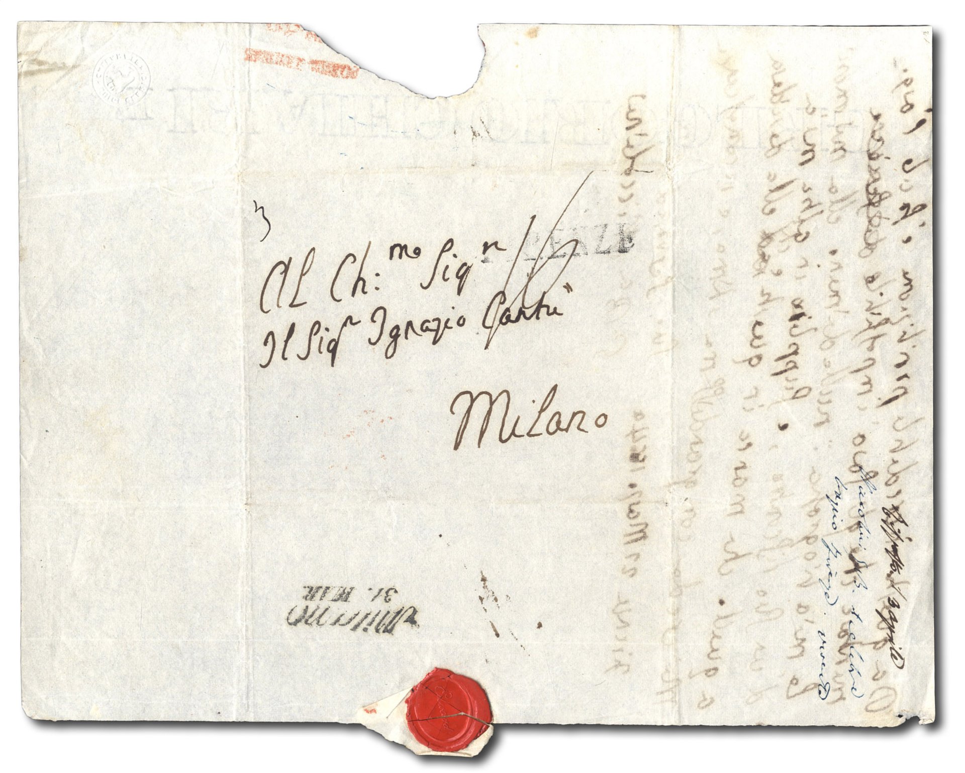 >1/2 pagina in-4, indirizzo e sigillo al verso ''Al Ch.mo Sig.re/Il Sig.r Ignazio Cantù/Milano'', in cui il Niccolini lo invita a voler leggere la sua biografia ''..nulla di meno che ella mi onori di un suo riscontro... con grandissima stima e riconoscenza...''. Ignazio Cantù (1810-1877) fu, nel panorama culturale italiano dell'Ottocento, se non un protagonista di certo una personalità di rilievo, impegnata non solo nella narrativa, ma anche nella ricostruzione di vicende storiche. Giovanni Battista Niccolini (San Giuliano Terme, 29 ottobre 1782 – Firenze, 20 settembre 1861) è stato un drammaturgo italiano. Visse a Firenze, Lucca e Prato, e fu socio dell'Accademia della Crusca. Compose diverse tragedie di soggetto storico-patriottico. Fu conosciuto come un propugnatore dell'unità e dell'indipendenza d'Italia; fu amico del Foscolo, che gli dedicò la traduzione della Chioma di Berenice.