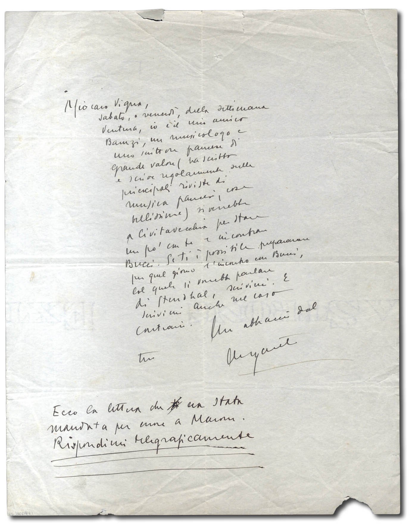 >1 pagina in-4 (mm 290x225), vergata in chiara grafia e firmata "Ungaretti", relativa al fascino che il mito di Stendhal dovette esercitare anche su Ungaretti. Il poeta scrive a un non meglio identificato amico Vigna (''Mio Caro Vigna'') per annunciargli una sua prossima visita a Civitavecchia, insieme ad un musicologo francese di nome Banzi: ''....sabato, o venerdì della settimana ventura, io e il mio amico Banzi, un musicologo e uno scrittore francese... si verrebbe a Civitavecchia''. Domanda al corrispondente di fissare un appuntamento con Bucci, da identificare con Clodoveo Bucci, per poter visionare alcuni manoscritti e volumi appartenuti a Sthendal, attualmente conservati presso il Comune di Milano nel fondo Stendhaliano Bucci (''...se ti è possibile preparare per quel giorno l'incontro con Bucci, col quale si potrebbe parlare di Sthendal, scrivimi''). Il primo custode di questa importante raccolta dei libri appartenuti a Sthendal e rinvenuti nel 1842, anno della morte del celebre scrittore francese, è stato Donato Bucci (1798-1870), suo fedele amico e poi suo esecutore testamentario per i beni lasciati in Italia. Morto Donato è appunto il nipote Clodoveo (1855-1942) che continua a conservare i volumi e gli altri cimeli stendhaliani. Con il cambio di secolo inizia a fiorire intorno ai documenti rimasti in Italia un'attenzione non più dettata solo dalla semplice curiosità di vedere la biblioteca del console scrittore, ma rivolta ad indagare gli autografi contenuti nei libri mentre Stendhal si avvia ad essere uno scrittore di culto. Clodoveo Bucci è disponibile possessore della raccolta; con lui gli stendhaliani si relazionano per avere accesso ai volumi e Casa Bucci diventa sia una meta privilegiata degli studiosi: hanno lasciato traccia del loro passaggio tra gli altri appunto Ungaretti (come questa importante lettera sembra confermare), Gian Pietro Lucini, Margherita Sarfatti e Alberto Savinio. La Raccolta venne venduta nel 1942 dagli eredi di Clodoveo a Federico Gentile, figlio del senatore Giovanni Gentile. La visita di Ungaretti è quindi da collocare proprio nel ‘42, anno in cui il poeta rientrò in Italia dopo il lungo soggiorno a San Paolo del Brasile. Curioso anche il fatto che la lettera venne spedita ad un destinatario erroneo come si legge in calce da mano dello stesso Ungaretti: ''Ecco la lettera che era stata mandata per errore a Maroni. Rispondi Telegraficamente''.In perfetto stato (piccola mancanza nel margine inferiore, ininfluente).