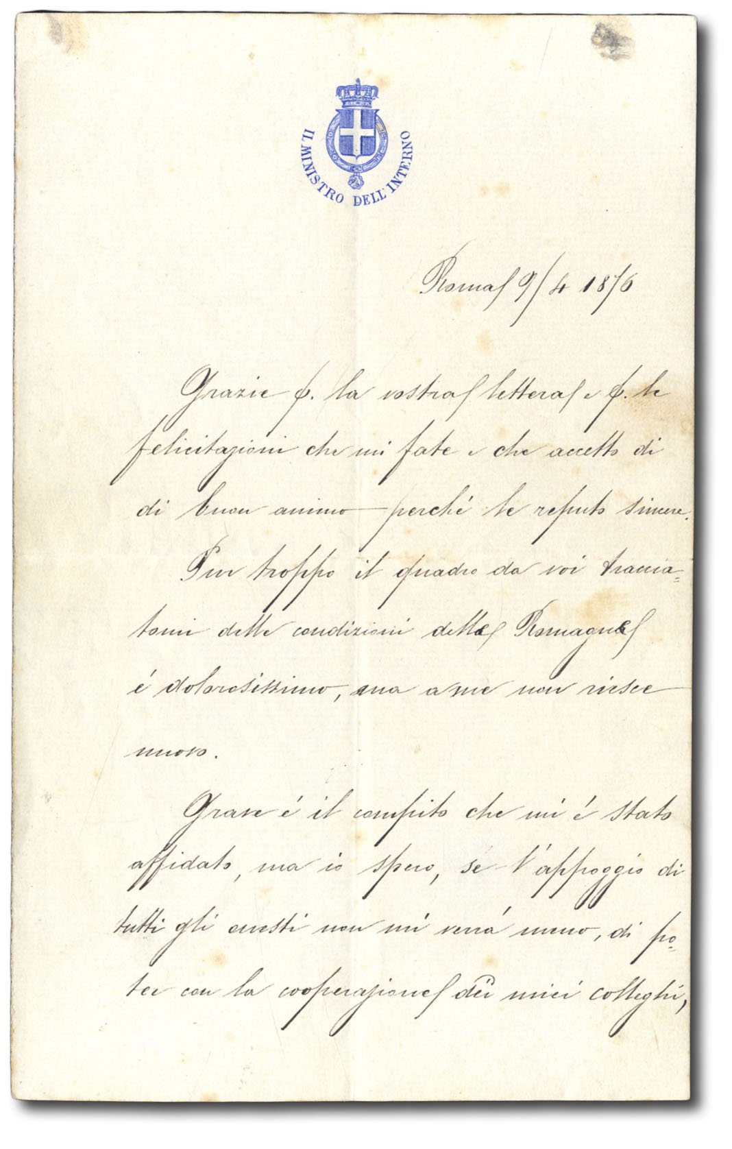>lettera di 2 facciate in-8 (230x125 mm) su carta intestata ''Il Ministro dell'Interno'' autografe firmate indirizzate al ''Sig. Eugenio Valzania Cesana''. Nicotera era stato nominato da appena due settimane Ministro dell'Interno; in questa missiva ringrazia delle felicitazioni ma lamenta le difficoltà dell'incarico: ''Pur troppo il quadro da voi tracciatomi delle condizioni delle Romagne è dolorosissimo, ma a me non riesce nuovo. Grave è il compito che mi è stato affidato...''. Eugenio Valzania (1821-1889) originario di Cesana fu patriota mazziniano e poi garibaldino.