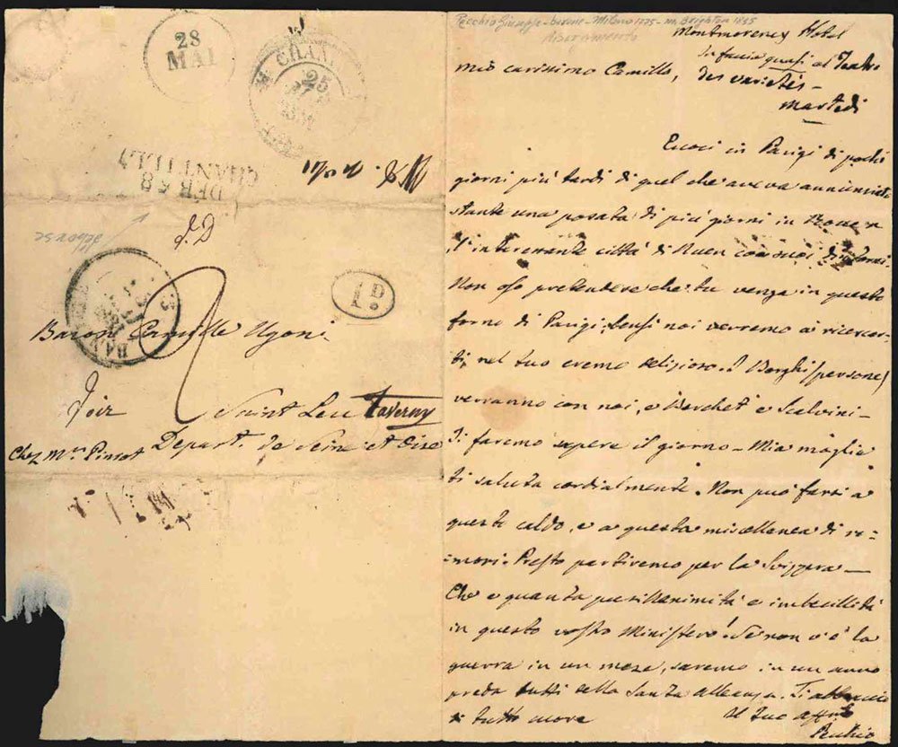 AUTOGRAFOLettera amichevole con accenni patriottici: “[.] non oso pretendere che tu venga in questo forno di Parigi; bensì noi verremo a ricercarti nel tuo eremo religioso! Bonghi [.] verranno con noi, e Berchet e Scalvini. Ti faremo sapere il giorno [.]. Se non c'è la guerra in un mese saremo in un anno preda tutti della Santa Alleanza [.]”.