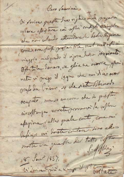 AUTOGRAFOLettera inviata da Bologna nella quale cita Olympe Pélissier, colei che diventerà la sua seconda moglie. La donna, un po’ annoiata della permanenza in Romagna, decide di trascorrere un periodo a Parigi: “Vi scrivo queste due righe onde pregarvi volere assistere coi vostri consigli Olimpia che non volendo attendere la bella stagione come era forse più fattibile [?], vuol mettersi ora in viaggio malgrado il rigore della stagione [?]: offritele denaro, se gliene occorre, esaminate vi prego il legno che mi dice di aver preso da Prieur [.]. Fatemi il favore di dire all’Imballatore che abita di rimpetto la Locazione del Teatro che vi faccia venire il mio spedizioniere [.] e domandatele conto delle casse spedite in Italia al momento della mia partenza per Parigi [.]. Ho ricevuto un pianoforte che è partito quindici giorni dopo le casse sud. e questo spedito da Pleyel come si fa che io non sappia nulla degli oggetti speditemi dal mio spedizioniere [.]”.