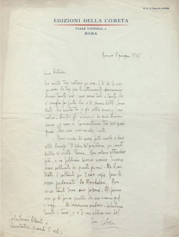 Lettera autografa firmata inviata a “Caro Arturo”. Datata 5 giugno 1945, Roma