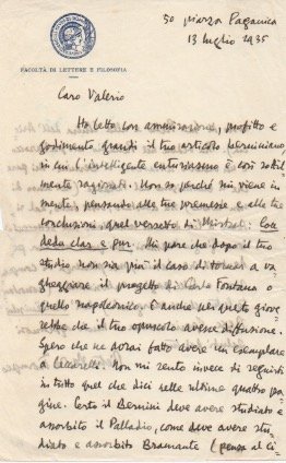 AUTOGRAFO“[.] ho letto [.] il tuo articolo berniniano, in cui l'intelligente entusiasmo è così sottilmente ragionato [.] .non mi sento invece di seguirti in tutto quel che dici nelle ultime quattro pagine. Certo il Bernini deve aver studiato e assorbito il Palladio, come deve aver studiato e assorbito il Bramante [.]. Ma vedere nel Palladio un prebarocco è un vederlo attraverso il Bernini [.]”.