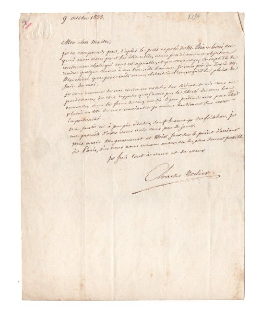 AUTOGRAFONodier, scrittore ed entomologo, propagatore del primo Romanticismo, fu anche un appassionato bibliografo e bibliofilo. La lettera è diretta a Salvi, “homme de lettres”. “Mon cher Maitre, je ne comprends pas, d’après le petit exposé de M. Bianchieri, en quoi mon nom peut lui être utile, mais je n’ai aucune objection contre une chose qui vous est agréable, et que vous croyez susceptible de rendre quelque service à un honnête homme. Je vous prie de dire à M. Bianchieri que je ne mets aucun obstacle à l’usage qu’il lui plaira de faire de moi. Je vous remercie de vos curieuses notules sur Ariane, mais vous me pardonnerez de vous rappeler que j’avais pris la liberté de vous les demander sous la forme de cinq ou six lignes préliminaires pour être placées en tête de mes variantes. Je reviens hardiment sur cette importunité. Ma santé est à peu près rétablie ; sauf beaucoup de faiblesse. Je me promets d’aller vous voir sous peu de jours. Mes amis Magnoncourt et Weiss sont sur le point d’arriver à Paris, où nous nous verrons ensemble le plus souvent possible [.]”.