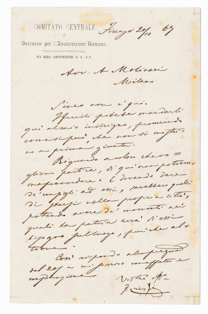 AUTOGRAFO“[.] I fucili potete mandarli qui al mio indirizzo, procurando come si può, che non si mostrino a prima giunta. Riguardo a coloro che voglion partire, di qui non potremmo provvedere. E dovendo dare de’ consigli ad essi, sarebbero quelli di starsi nella propria città, potendo avere de’ momenti nei quali la patria avrà di essi bisogno sul luogo [.]”.