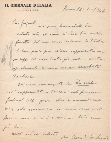 AUTOGRAFO“[.] mi viene domandato da codesta sede che cosa si deve dire sulla fascetta del mio nuovo volume di teatro. Si dica, press'a poco, ch'esso rappresenta uno sviluppo del mio teatro già noto e contiene gli elementi di una nuova sensibilità teatrale [.]”.
