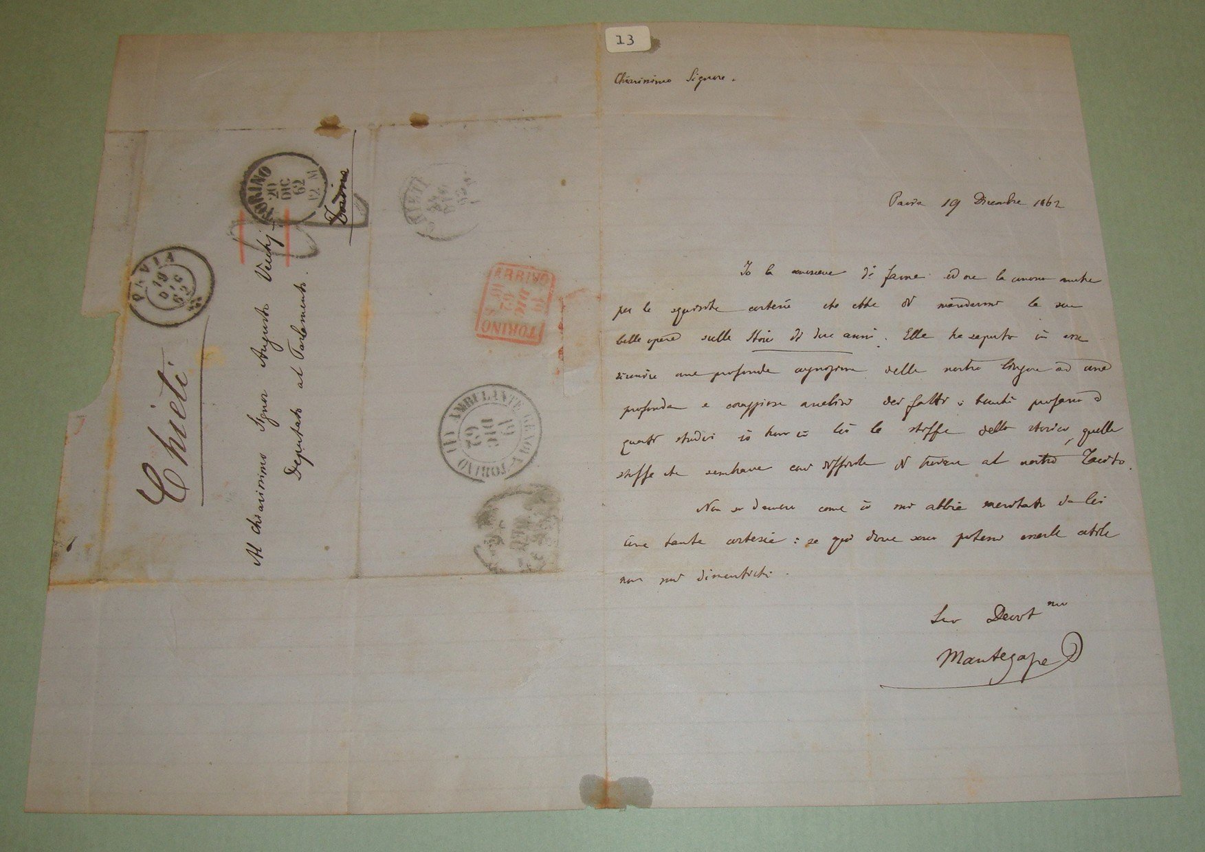 MANTEGAZZA Paolo. Prolifico scrittore, patriota risorgimentale. 1831 - 1910. Lettera autografa firmata in 8vo. Pavia 19 dicembre 1862. Indirizzata ad Augusto Vecchi, Torino. Timbri precursori. Ringraziamenti forbiti per un'opera ricevuta: "Storie di due anni": "Ella ha saputo in essa riunire una profonda cognizione della nostra lingua ad una profonda e coraggiosa analisi dei fatti".