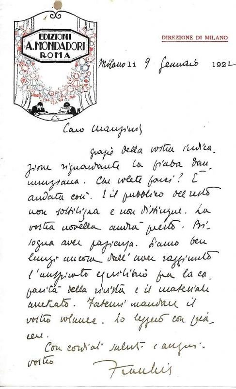 Lettera di 16 righe più la firma di carattere letterario. -(Mondadori, nel 1917 la fusione con la Tipografia di Verona Gaetano Franchini, che comportò l’ingresso dei fratelli Franchini nella società).