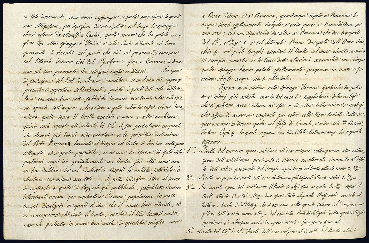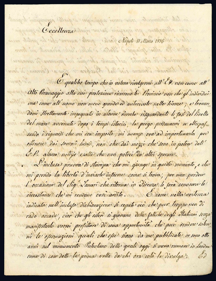 Bifolio manoscritto autografo (mm 262x200), nel quale Niccolini, dopo aver brevemente spiegato di essere al momento impegnato in alcune “…ricerche riguardanti le fasi del livello del mare avvenute dopo i tempi istorici…”, domanda all'E.V. di promuovere alcuni rilevamenti nei territori di sua competenza in modo da potergli fornire ulteriori dati sui quali poter lavorare. Un po' brunito.