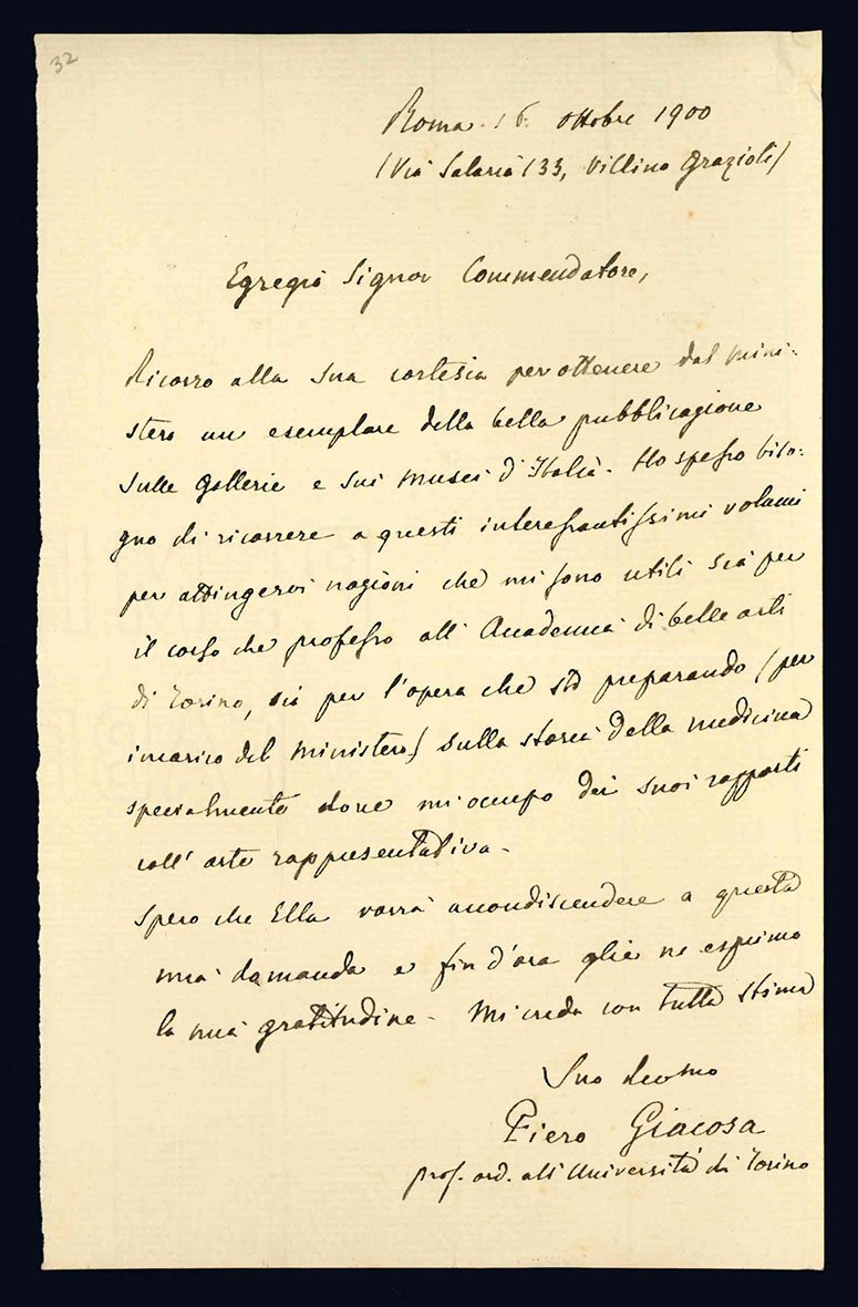 Foglio volante manoscritto autografo (mm 203x128) nel quale Giacosa chiede l'intervento dell'“Egregio Signor Commendatore” per ottenere dal Ministero un esemplare della “bella pubblicazione sulle Gallerie e sui Musei d'Italia”. Bianco il verso.
