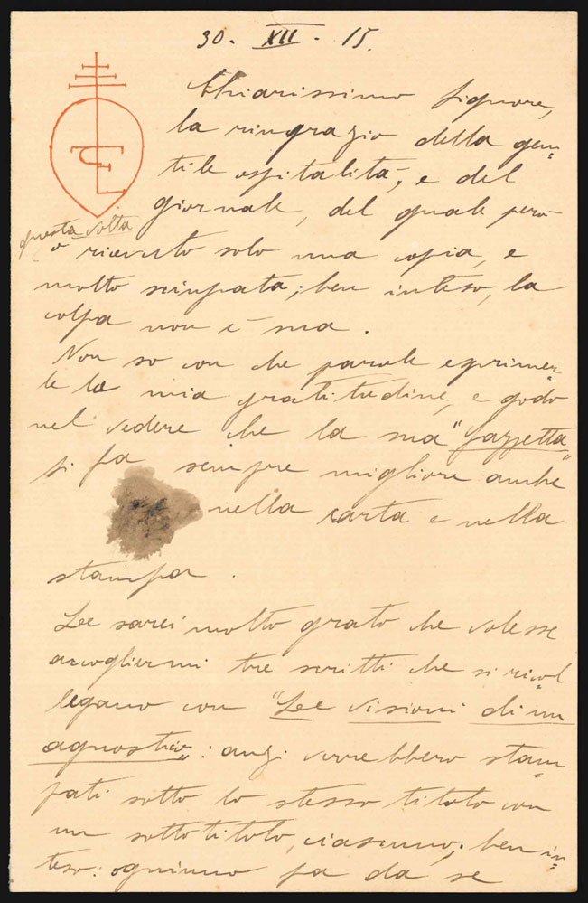 Lettera autografa siglata, inviata al direttore della Gazzetta Ferrarese, su bella carta intestata col simbolo dell’autore: globo e tripla croce con iniziali intrecciate «T F L d P»