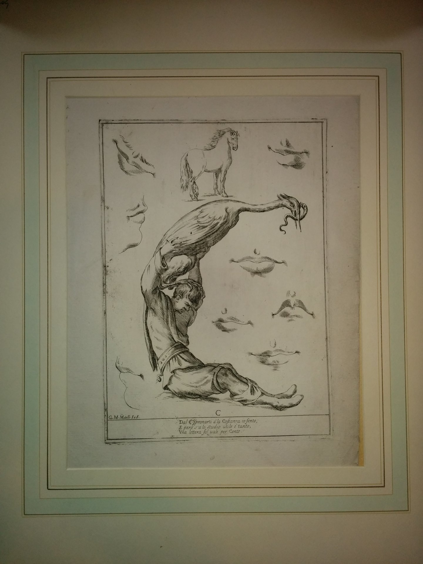 >Incisione all'acquaforte, f. 26,5x19,5 cm. ca. Un uomo con un cigno sulle spalle forma la lettera ''C''. Tratta da '' Alfabeto in sogno''. Esemplare per disegnare di Giuseppe Maria Mitelli pittore Bolognese. ''Dal C spronati a la Costanza io sento,E prò s'a lo studio utile è tanto,Una lettera sol vale per Cento''. L'incisore e pittore bolognese Giuseppe Maria Mitelli pubblicò nel 1683 l'“Alfabeto in sogno”, un manuale di disegno in cui le lettere della lingua italiana prendono la forma di corpi umani, congiunti fra loro o con altri esseri viventi e oggetti. Mitelli, nell'introduzione dell'opera, racconta di essere stato visitato in sogno da Morfeo. Il mitologico ministro delle apparizioni oniriche circondò l'artista con forme e visioni pertinenti alla nobilissima arte del Disegno “nostro unico diletto, e mio singolar esercizio: egli mi rappresentò le lettere dell'Alfabeto formate da incomposti fantasmi e da confuse immagini, e mi comandò che dovessi disegnare in proporzionate figure quegli embrioni, che, appena nati, svaniscono.Onde, io di subito svegliato, qui li ho disposti con simmetria, e alla vostra diligente applicazione dedicati”.