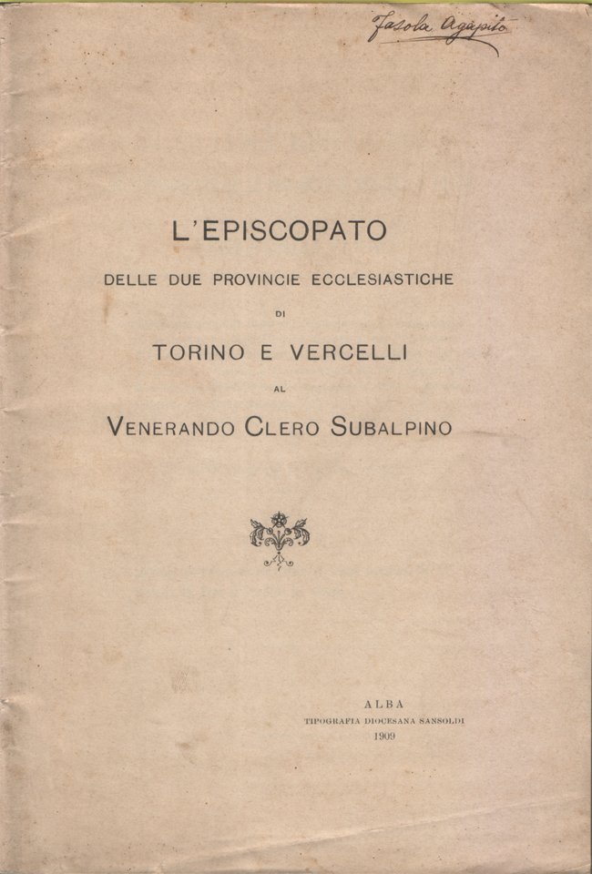 In-8°, pp. 45, copertina editoriale con normali segni del tempo. Nome scitto a penna, da mano coeva, nell'angolo superiore destro della copertina anteriore. In buono stato. Sommario: Gli Arcivescovi e Vescovi delle Province Ecclesiastiche Subalpine al Dilettissimo e Venerando Clero Salute e Benedizione. Insegnamento religioso; Modernismo. Pericoli pel giovane Clero; Perniciose conseguenze disciplinari e rimedi. Società di Previdenza e Mutuo Soccorso fra gli Ecclesiastici d'Italia eretta in Torino (documento inviato da Agostino Card. Arcivescovo di Torino, Teodoro Arcivescovo di Vercelli, Emiliano Vescovo di Fossano, Giuseppe Francesco Vescovo di Alba, Giambattista Vescovo di Pinerolo, Andrea Vescovo di Cuneo, Giovanni Battista Vescovo di Mondovì, Giuseppe Vescovo di Alessandria, Matteo Vescovo di Ivrea, Pietro Vescovo di Vigevano, Disma Vescovo di Acqui, Giuseppe Vescovo di Novara, Giovanni Vescovo di Saluzzo, Carlo Vescovo di Susa, Lodovico Vescovo di Casale, Giovanni Andrea Vescovo di Biella, Giovanni Vincenzo Vescovo di Aosta, Can. Carlo Vergano, già Vicario Generale di Mons. Giacinto Arcangeli, Vic. Cap. di Asti); Avvertimenti; Documenti: Lettera dell'Episcopato Subalpino radunato in Torino per le Conferenze annuali nel 1908 al Santo Padre Pio X; Risposta del S. Padre. Titolo completo: Lettera circolare dell'Episcopato delle Province di Vercelli e Torino al venerando Clero. Insegnamento religioso nelle scuole elementari. Suggerimenti di fronte alle condizioni create dall'art. 3° del Regolamento 6 Febbraio 1908. Pericoli del modernismo circa la fede e la disciplina; Avvisi al Clero a norma dei Ven. Documenti Pontificii relativi alla materia; Società di Previdenza e Mutuo Soccorso tra gli Ecclesiastici; Avvertimenti; Indirizzo dell'Episcopato Piemontese al Sommo Pontefice Pio X; Risposta del Papa all'indirizzo dei Vescovi.