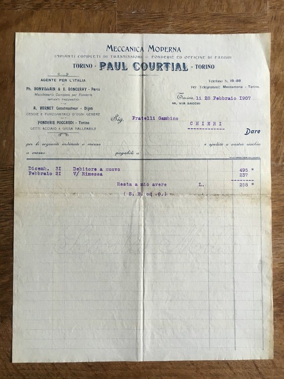 Lettera Commerciale Paul Courtial Torino 1907 - E21943